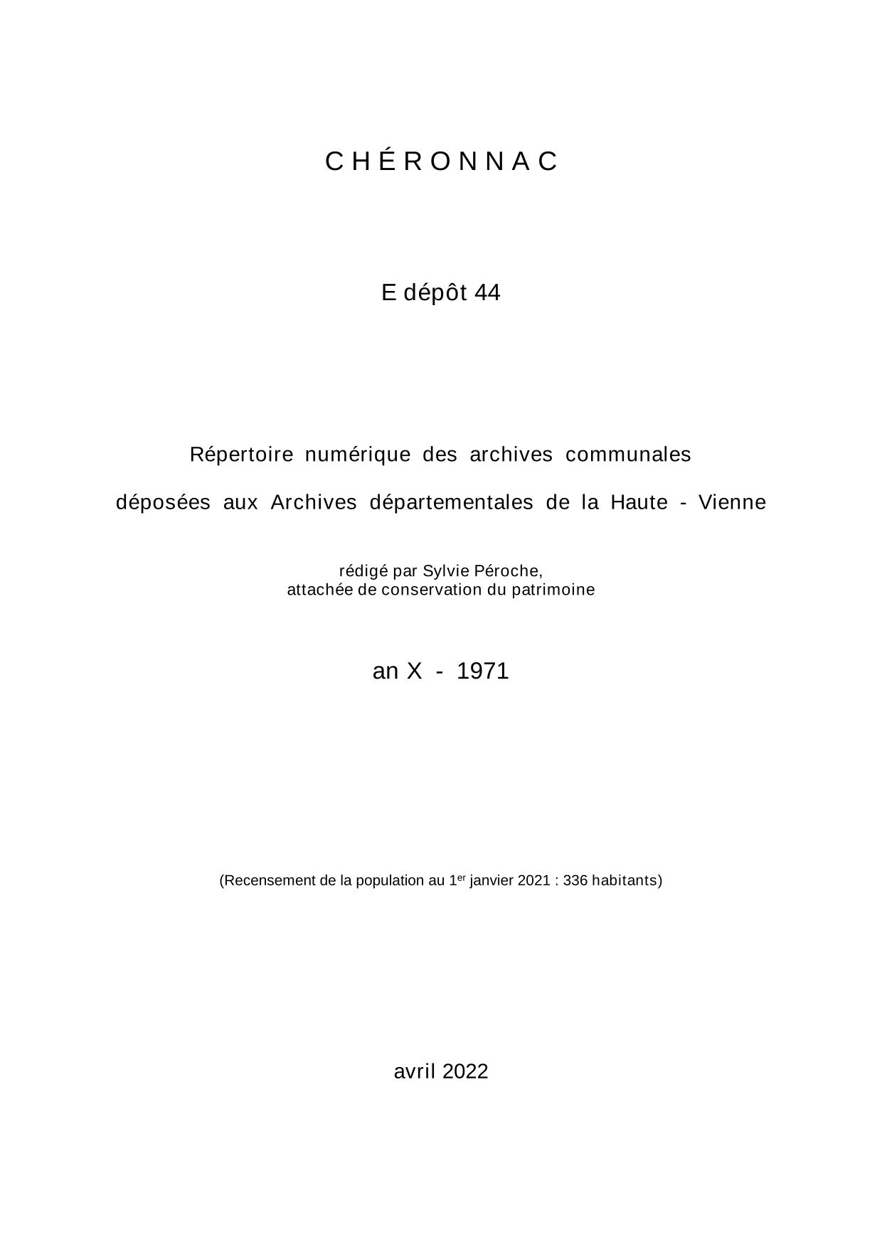 Commune de Chéronnac. Répertoire numérique des archives communales déposées aux Archives départementales de la Haute-Vienne, par S. Péroche, 2022, 14 p. dact.