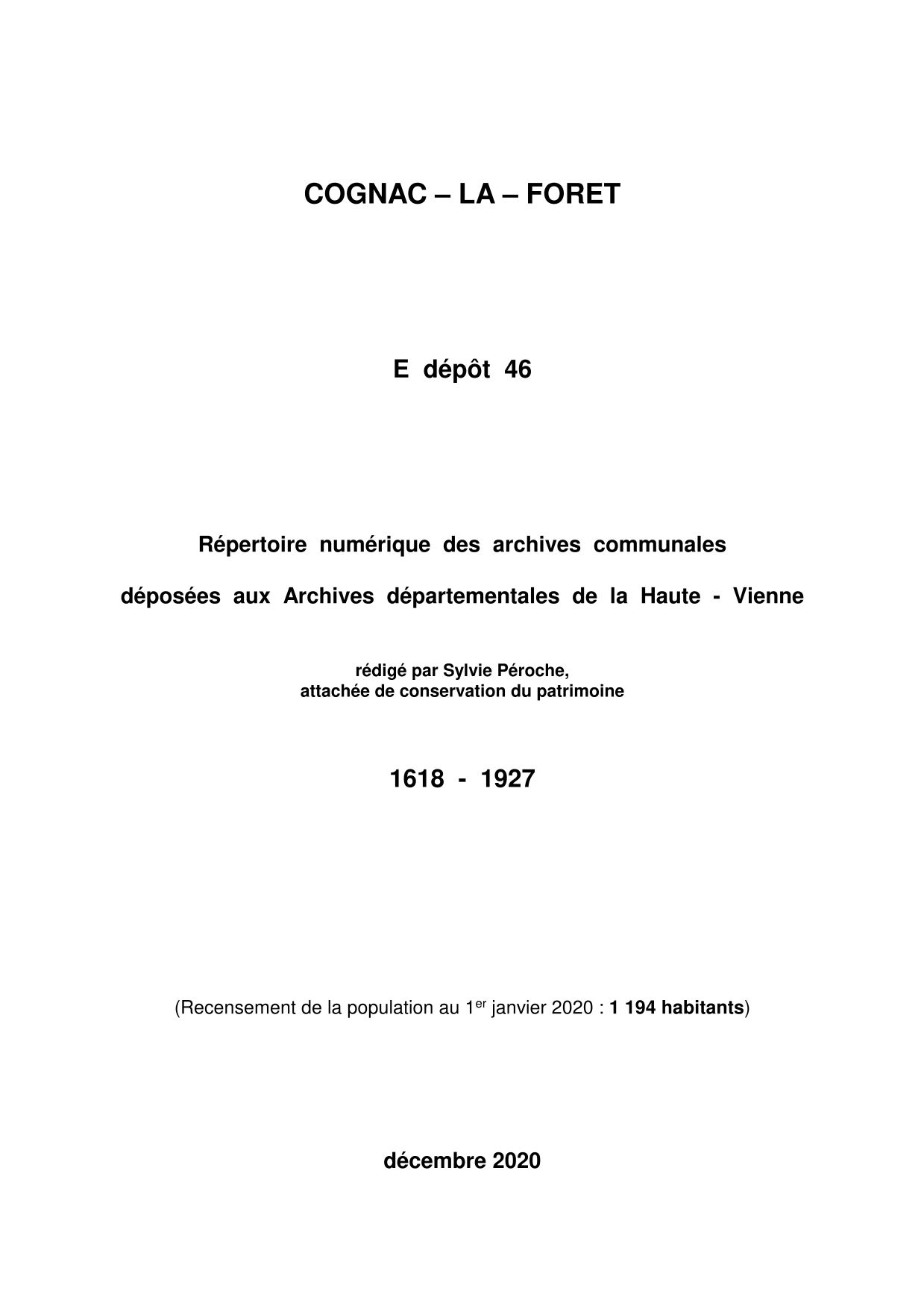 Commune de Cognac-la-Forêt. Répertoire numérique des archives communales déposées aux Archives départementales de la Haute-Vienne, par S. Péroche, 2020, 17 p. dact.