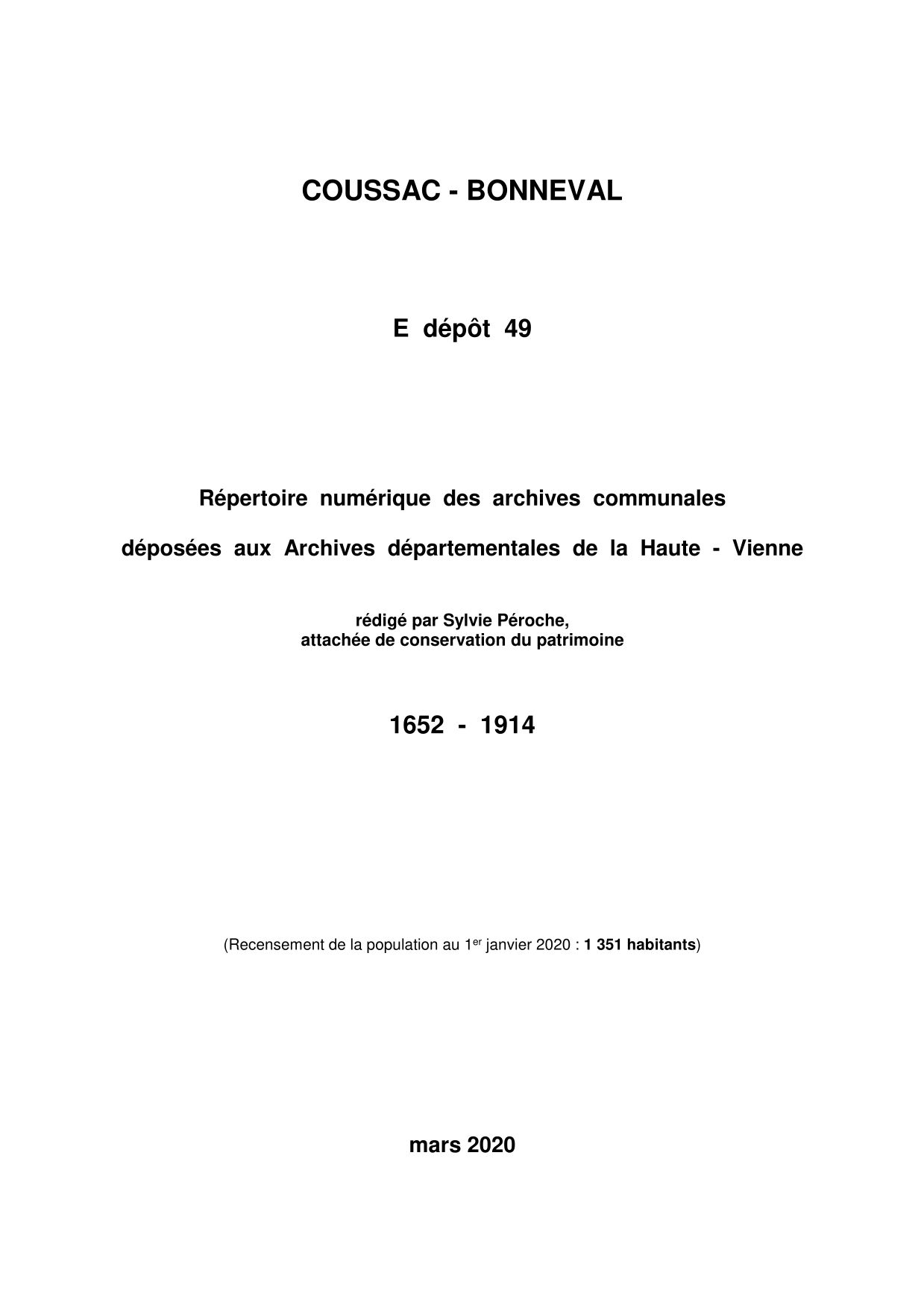 Commune de Coussac-Bonneval. État numérique des archives communales déposées aux Archives départementales de la Haute-Vienne, par S. Péroche, 2020, 11 p. dact.
