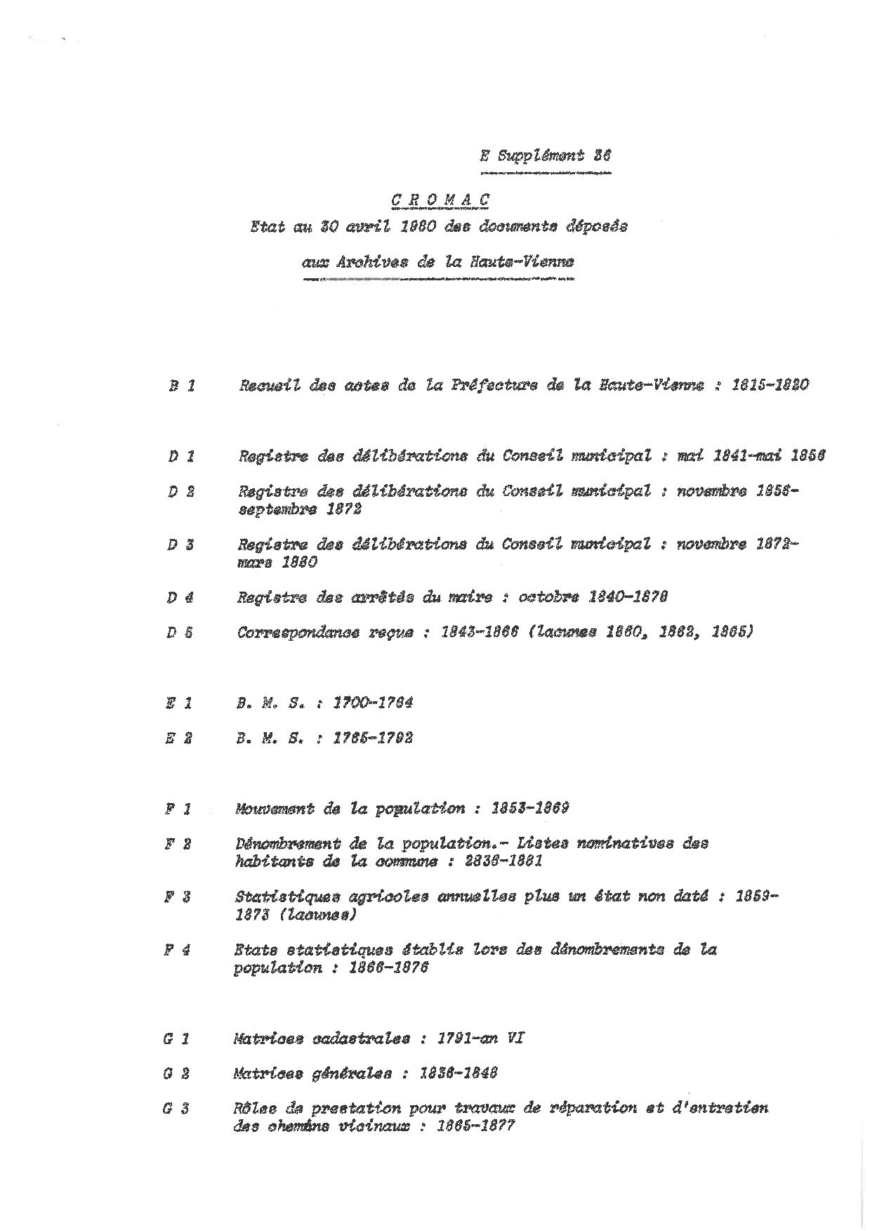 Commune de Cromac. État numérique des archives communales déposées aux Archives départementales de la Haute-Vienne, 1980, 3 p. dact.