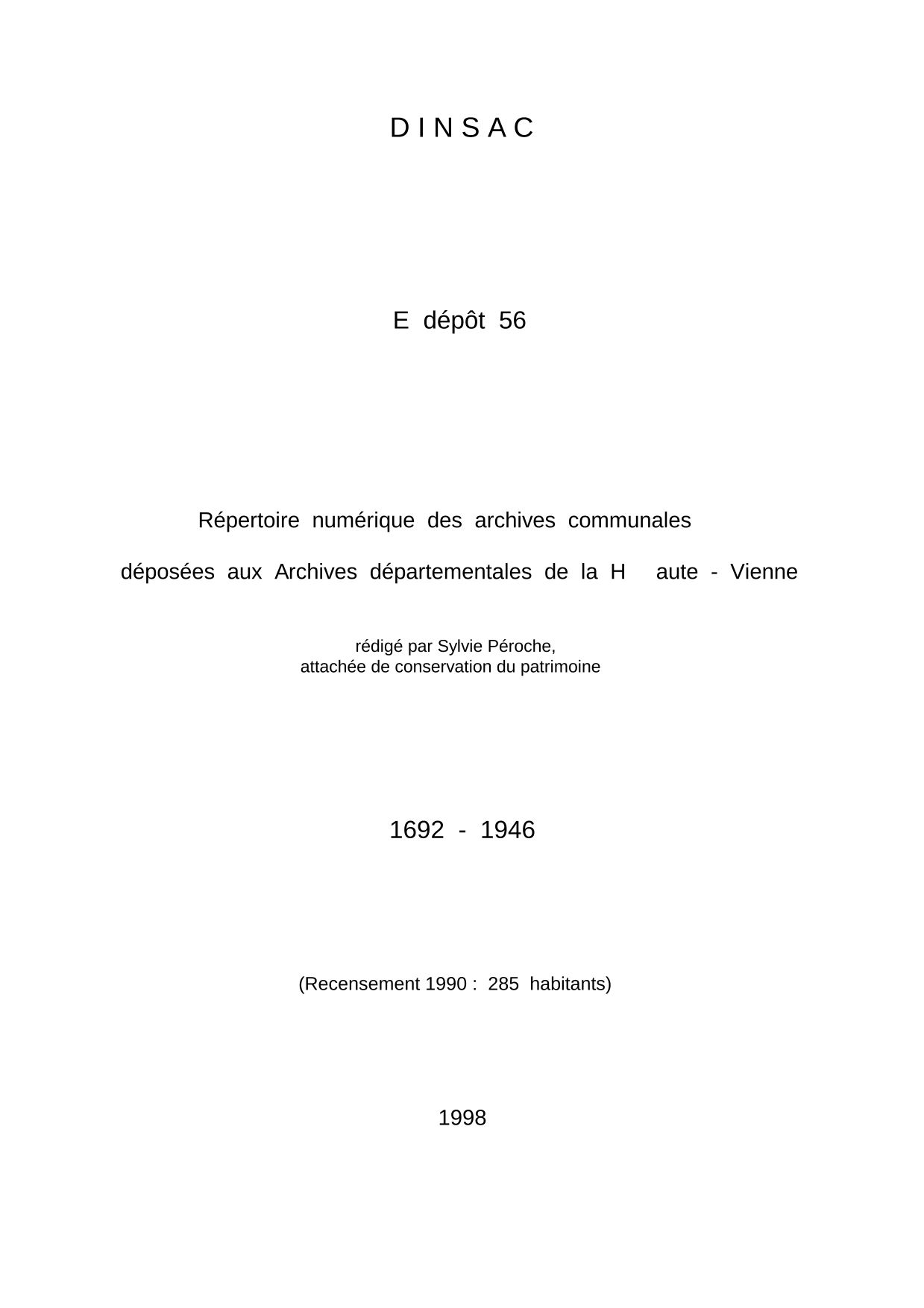 Commune de Dinsac. Répertoire numérique des archives communales déposées aux Archives départementales de la Haute-Vienne, par S. Péroche, 1998, 14 p. dact.