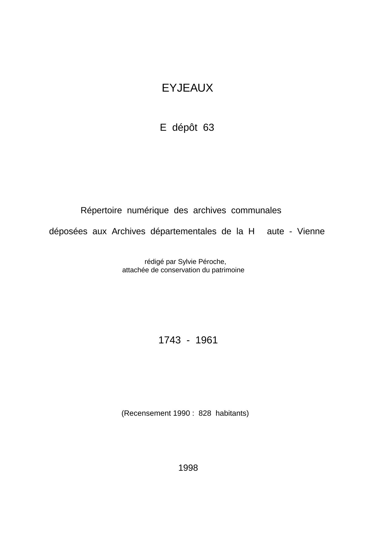 Commune d'Eyjeaux. Répertoire numérique des archives communales déposées aux Archives départementales de la Haute-Vienne, par S. Péroche, 1998, 18 p. dact.