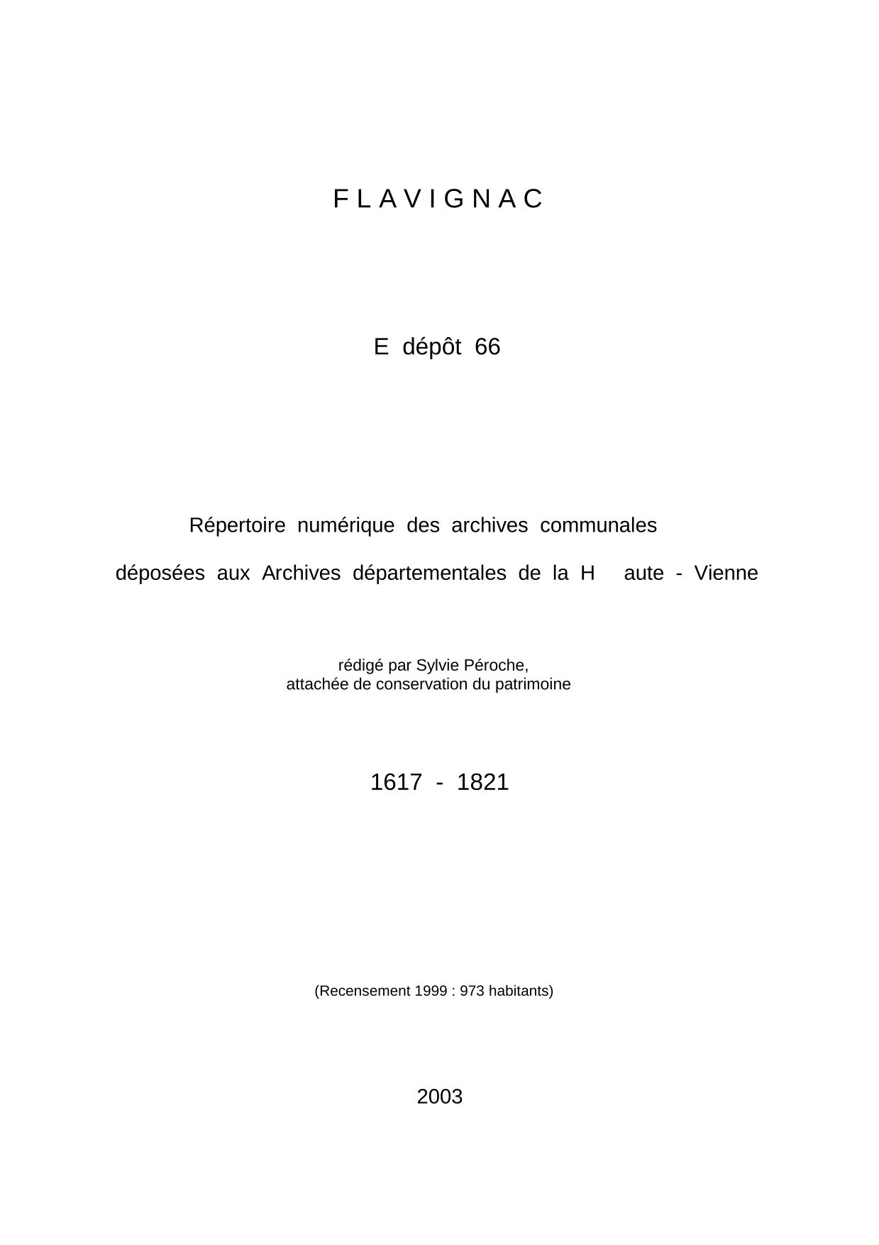 Commune de Flavignac. Répertoire numérique des archives communales déposées aux Archives départementales de la Haute-Vienne, par S. Péroche, 2003, 7 p. dact.