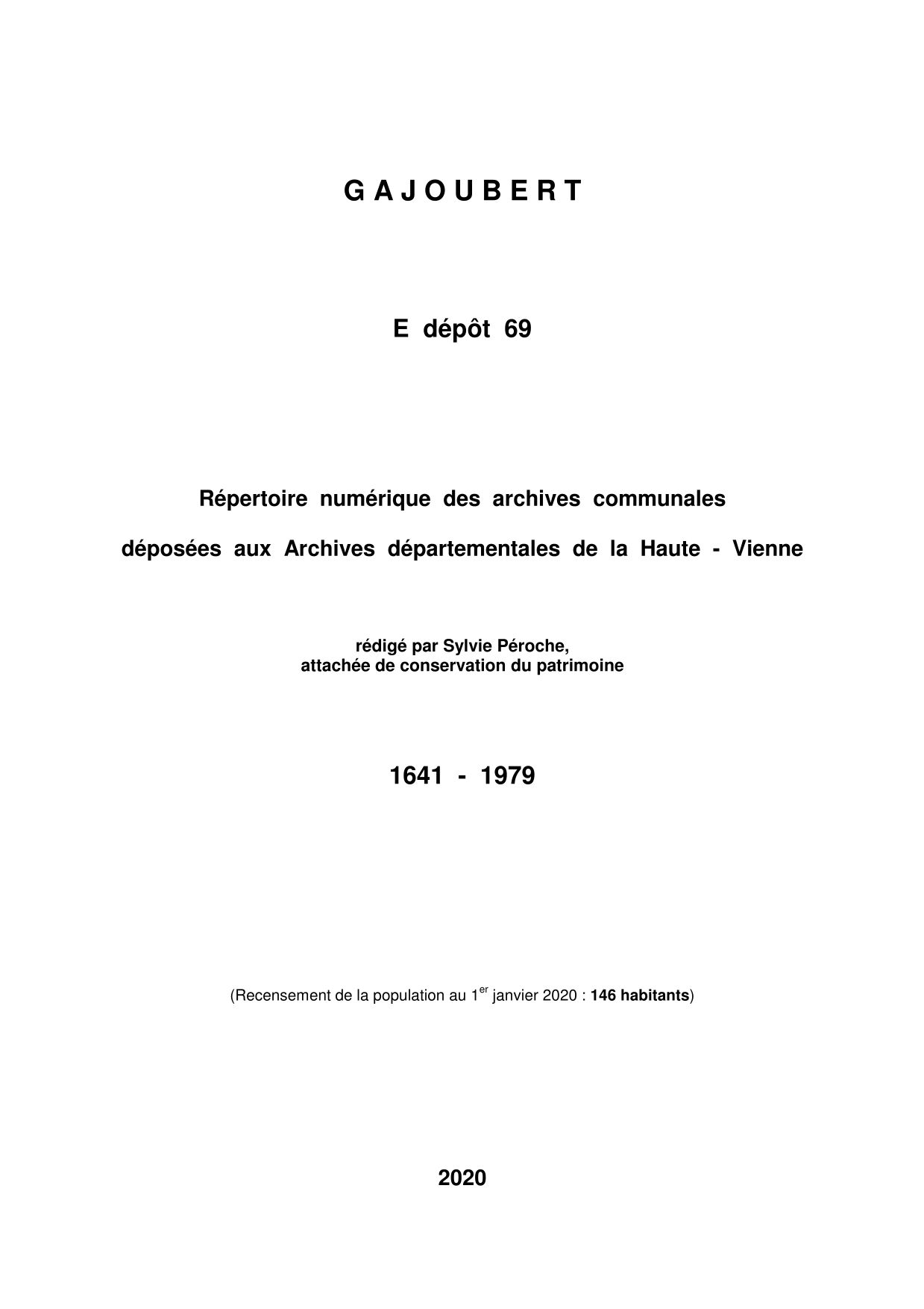 Commune de Gajoubert. Répertoire numérique des archives communales déposées aux Archives départementales de la Haute-Vienne, par S. Péroche, 2020, 16 p. dact.