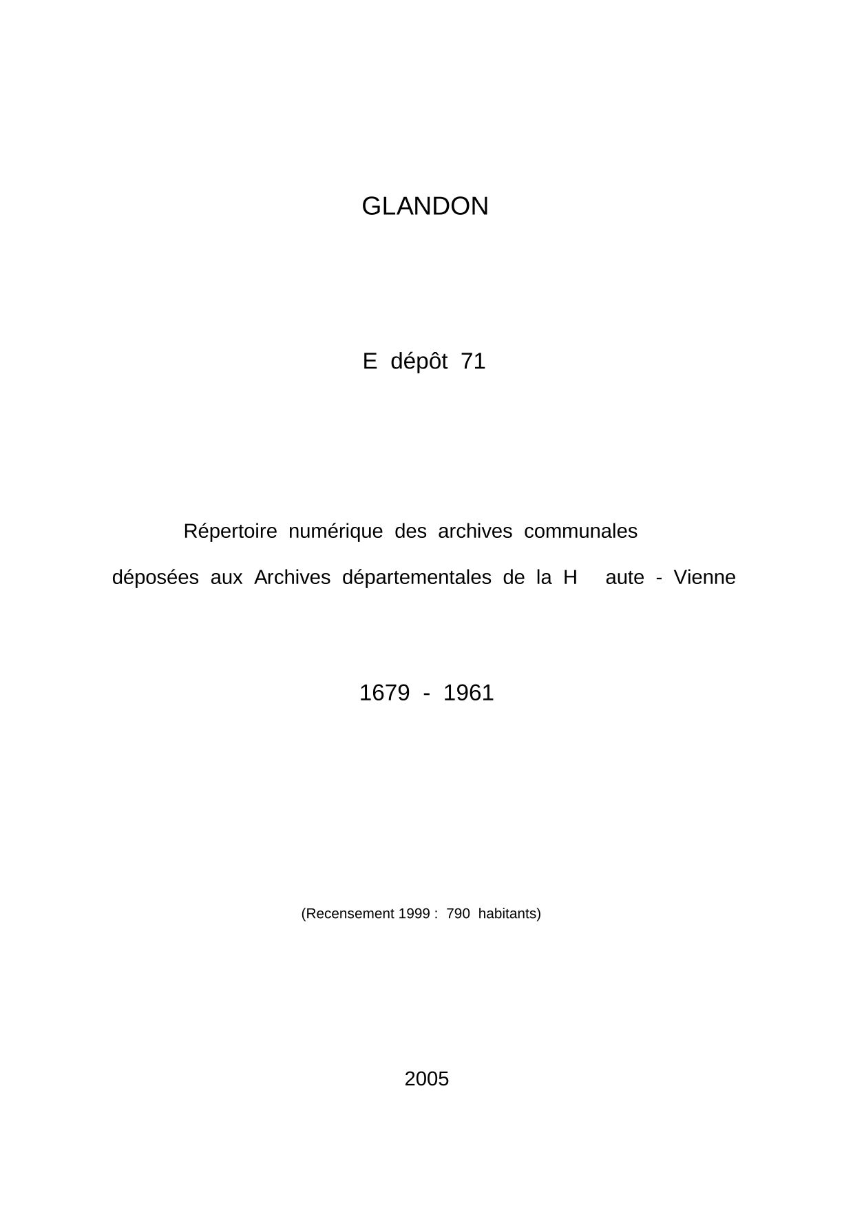 Commune de Glandon. Répertoire numérique des archives communales déposées aux Archives départementales de la Haute-Vienne, par S. Péroche, 2005, 7 p. dact.