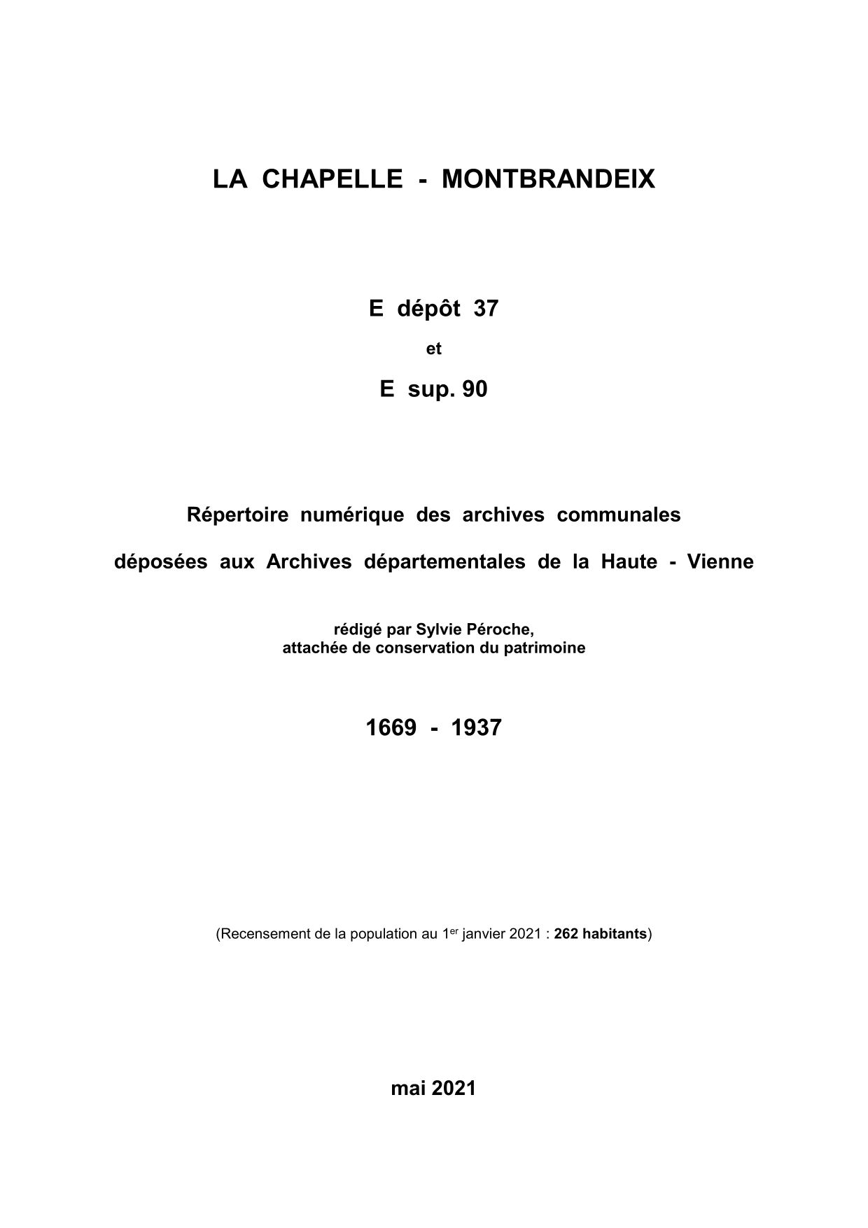 Commune de La Chapelle-Montbrandeix. Répertoire numérique des archives communales déposées aux Archives départementales de la Haute-Vienne, par Sylvie Péroche, 2021, 15 p. dact.
