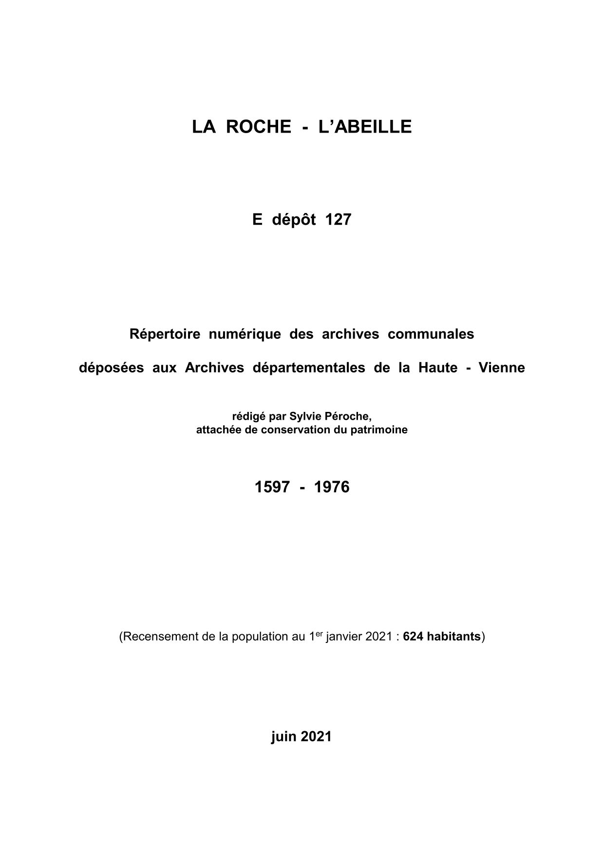 Commune de La Roche-l'Abeille. Répertoire numérique des archives communales déposées aux Archives départementales de la Haute-Vienne, par S. Péroche, 2021, 22 p. dact.