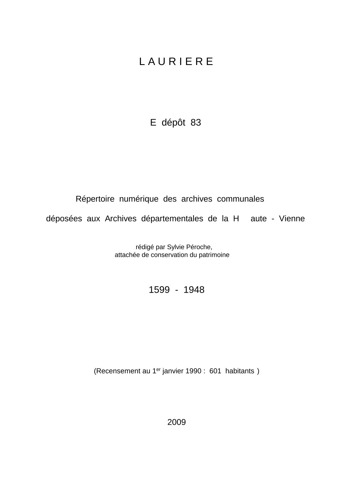 Commune de Laurière. Répertoire numérique des archives communales déposées aux Archives départementales de la Haute-Vienne, par S. Péroche, 2009, 17 p. dact.