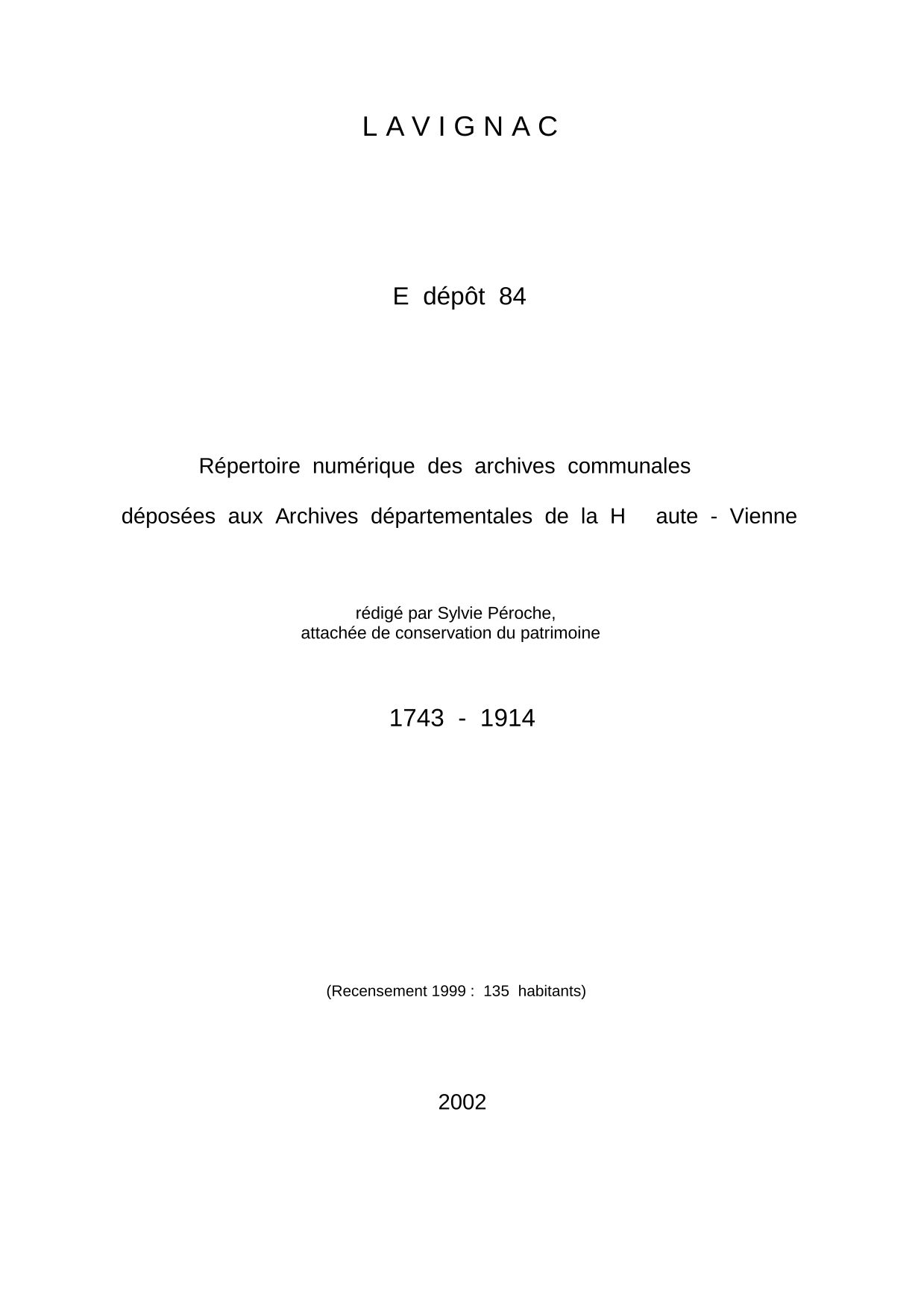 Commune de Lavignac. Répertoire numérique des archives communales déposées aux Archives départementales de la Haute-Vienne, par S. Péroche, 2002, 15 p. dact.