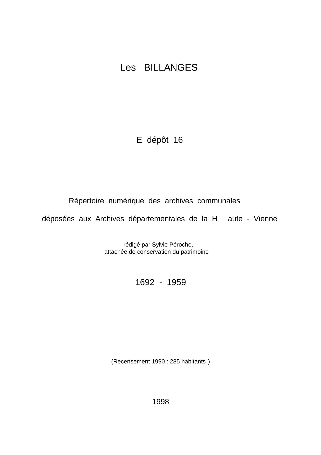 Commune des Billanges. Répertoire numérique des archives communales déposées aux Archives départementales de la Haute-Vienne, par S. Péroche, 1998, 10 p. dact.