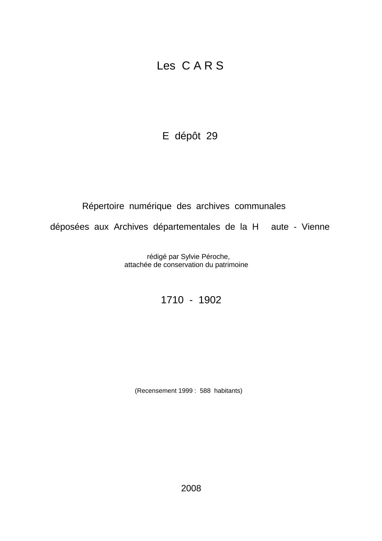 Commune des Cars. Répertoire numérique des archives communales déposées aux Archives départementales de la Haute-Vienne, par S. Péroche, 2008, 6 p. dact.