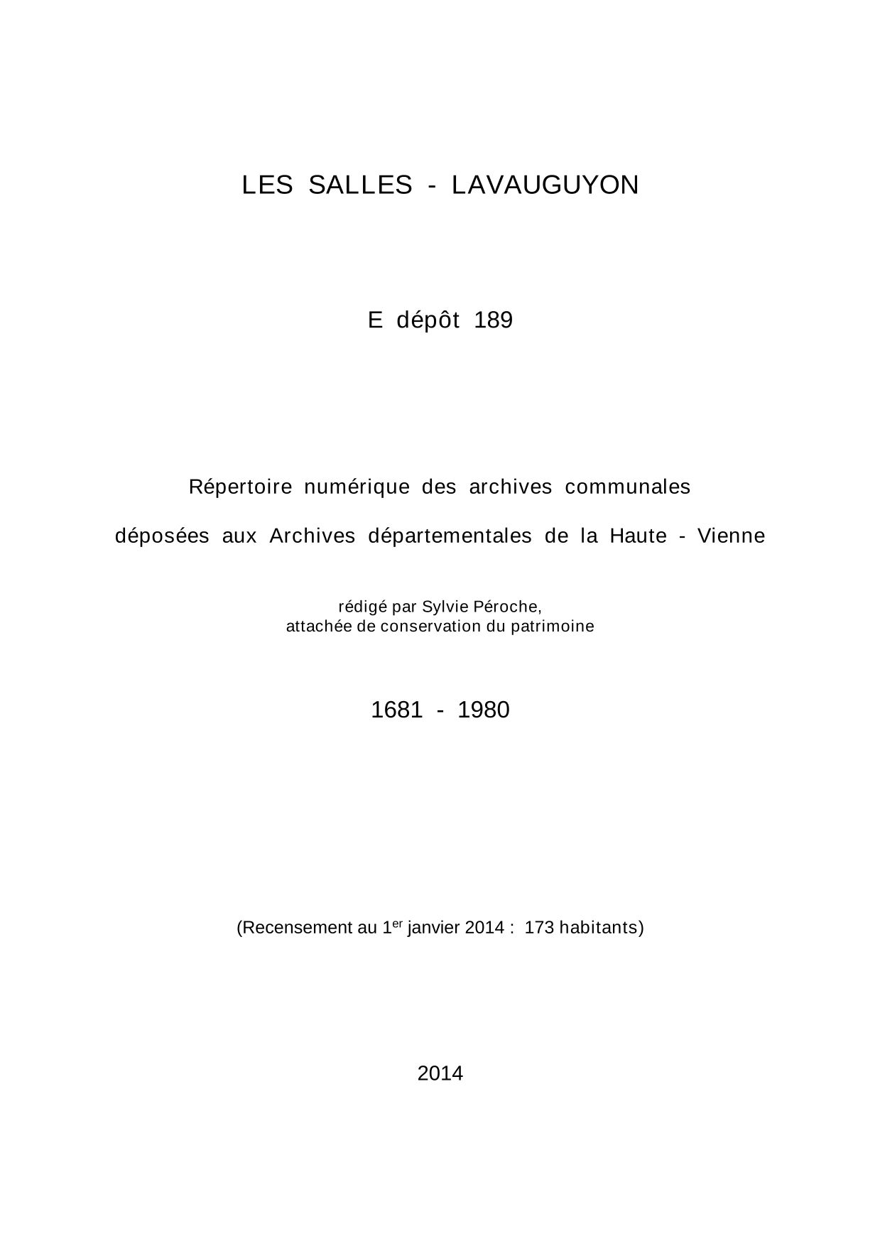 Commune des Salles-Lavauguyon. Répertoire numérique des archives communales déposées aux Archives départementales de la Haute-Vienne, par S. Péroche, 2014, 17 p. dact.