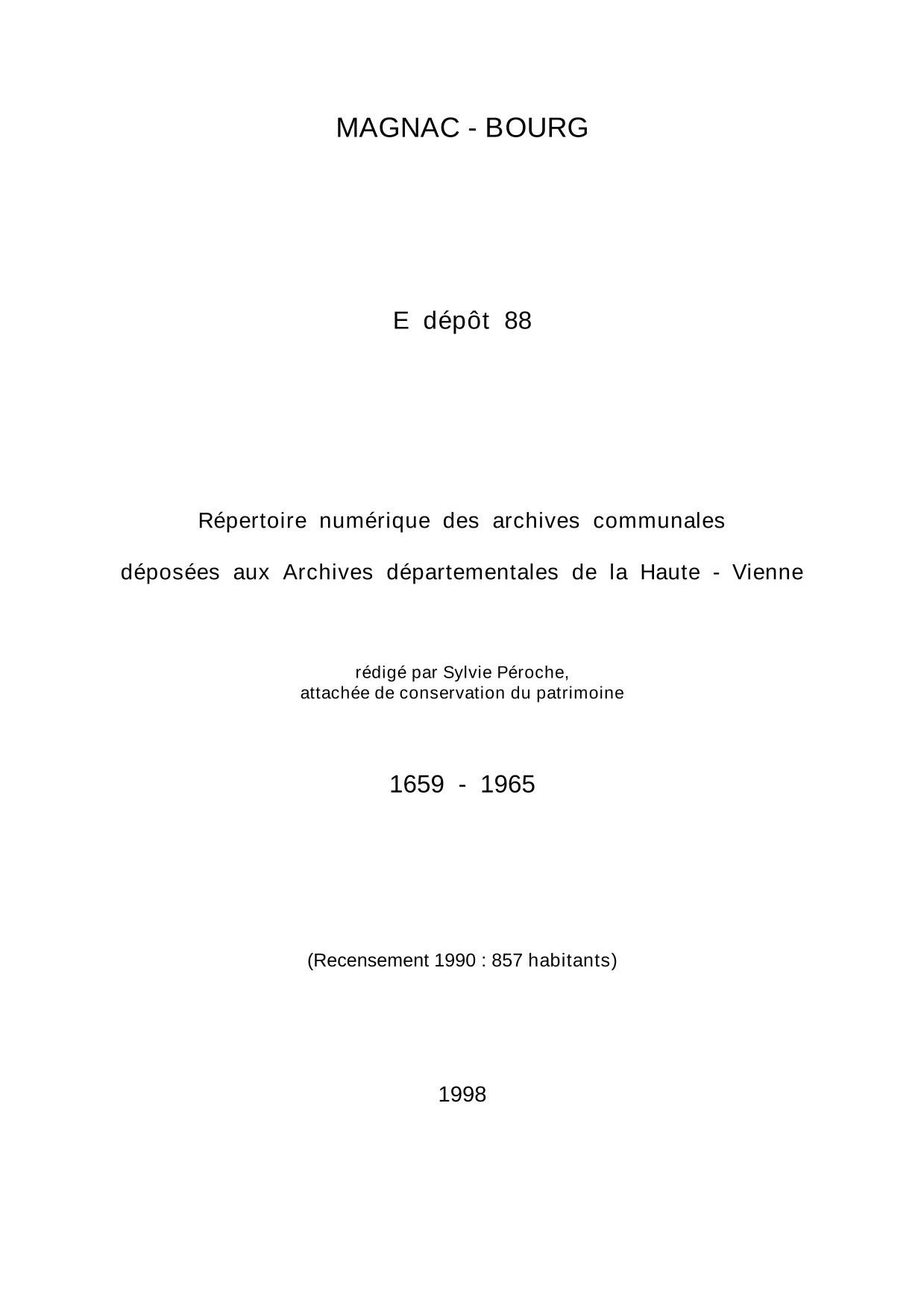 Commune de Magnac-Bourg. Répertoire numérique des archives communales déposées aux Archives départementales de la Haute-Vienne, par S. Péroche, 1998, 13 p. dact.