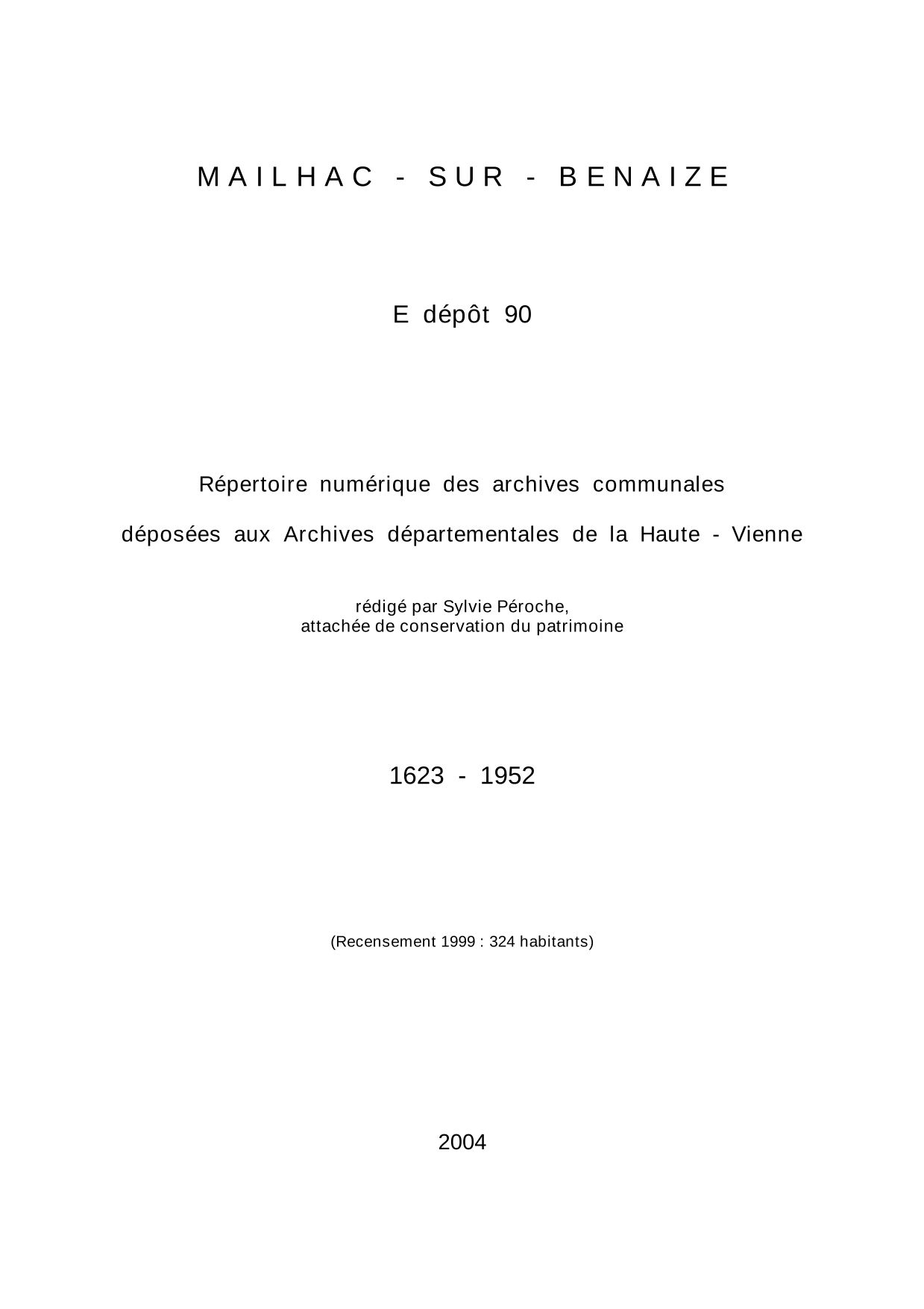 Commune de Mailhac-sur-Benaize. Répertoire numérique des archives communales déposées aux Archives départementales de la Haute-Vienne, par S. Péroche, 2004, 5 p. dact.
