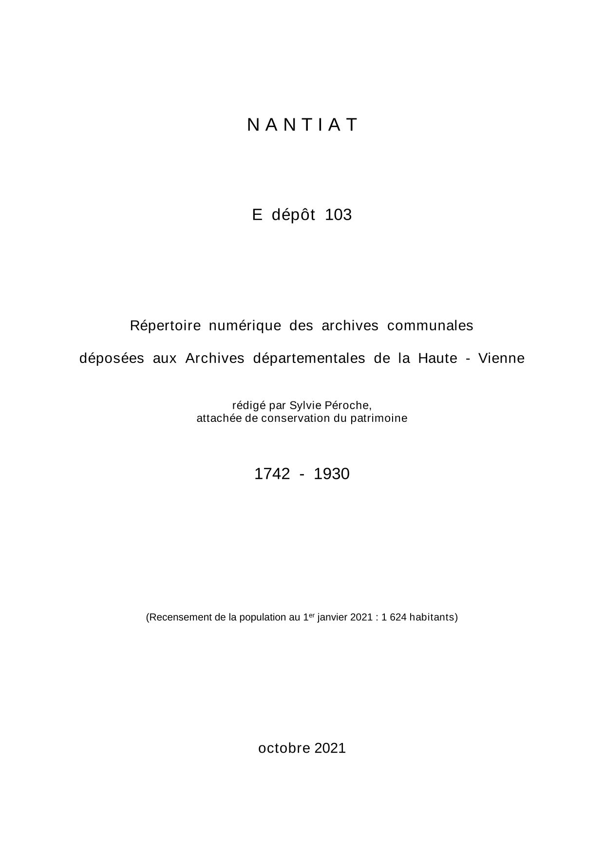 Commune de Nantiat. Répertoire numérique des archives communales déposées aux Archives départementales de la Haute-Vienne, par S. Péroche, 2021, 9 p. dact.