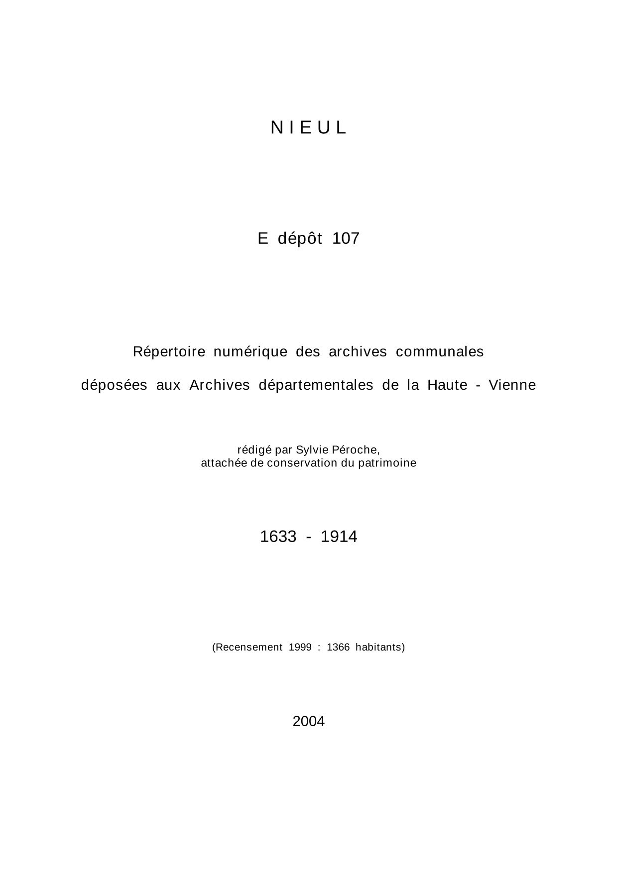 Commune de Nieul. Répertoire numérique des archives communales déposées aux Archives départementales de la Haute-Vienne, par S. Péroche, 2004, 10 p. dact.