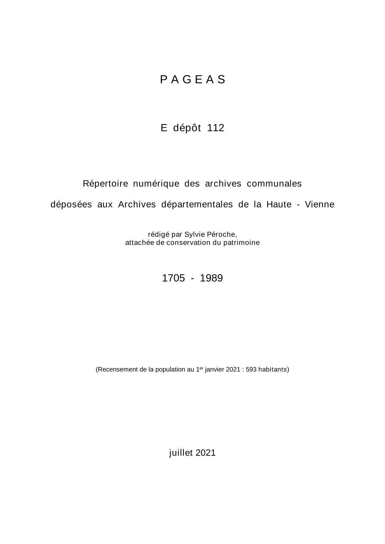 Commune de Pageas. Répertoire numérique des archives communales déposées aux Archives départementales de la Haute-Vienne, par S. Péroche, 2021, 23 p. dact.
