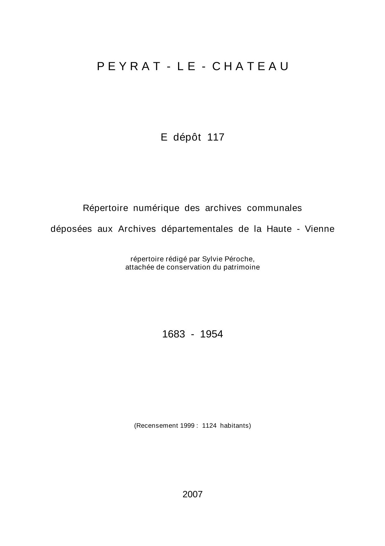 Commune de Peyrat-le-Château. Répertoire numérique des archives communales déposées aux Archives départementales de la Haute-Vienne, par S. Péroche, 2007, 17 p. dact.