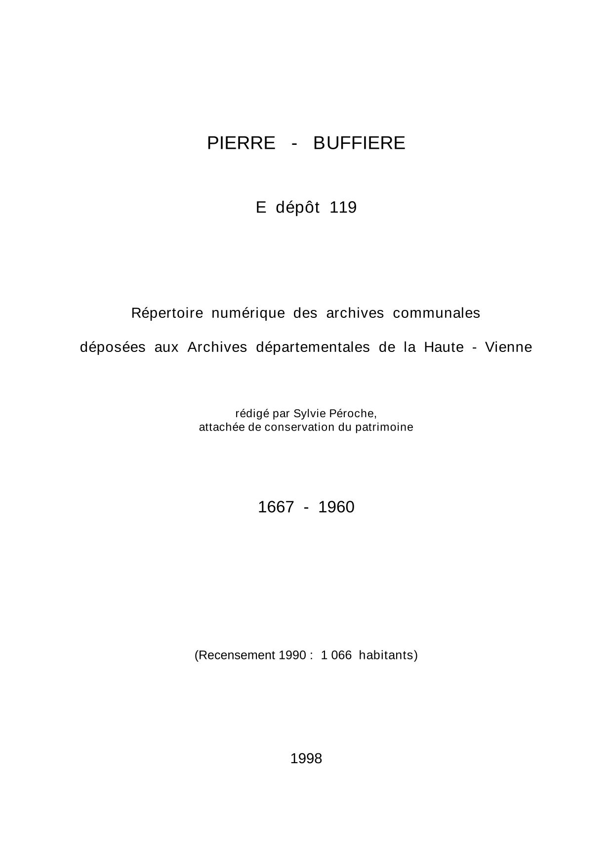 Commune de Pierre-Buffière. Répertoire numérique des archives communales déposées aux Archives départementales de la Haute-Vienne, par S. Péroche, 1998, 19 p. dact.