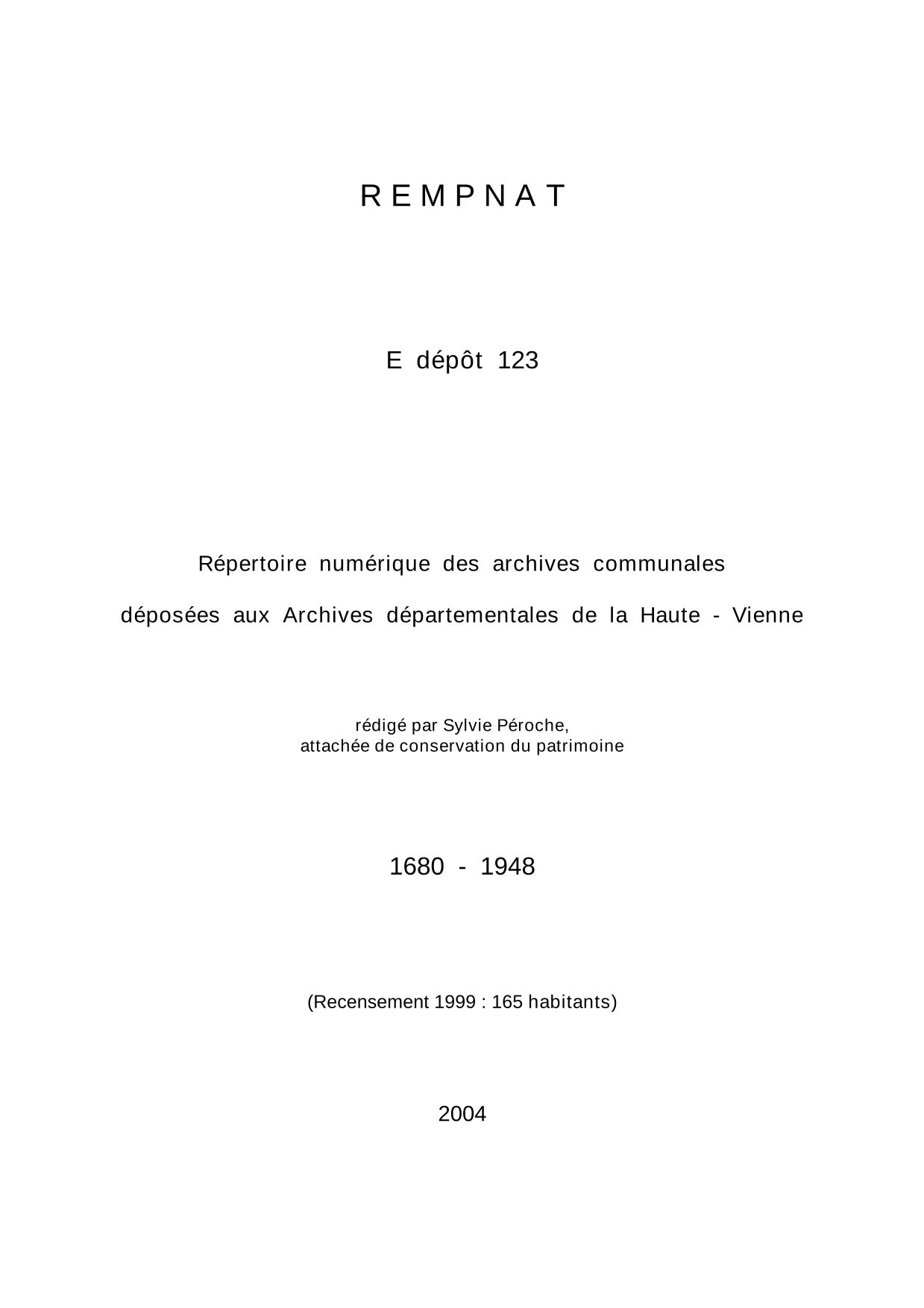 Commune de Rempnat. Répertoire numérique des archives communales déposées aux Archives départementales de la Haute-Vienne, par S. Péroche, 2004, 13 p. dact.