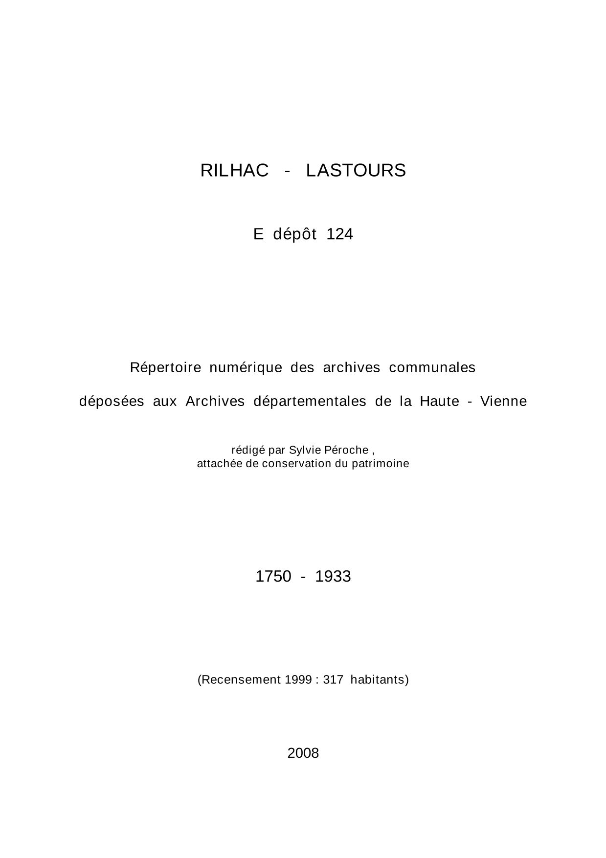 Commune de Rilhac-Lastours. Répertoire numérique des archives communales déposées aux Archives départementales de la Haute-Vienne, par S. Péroche, 2008, 8 p. dact.