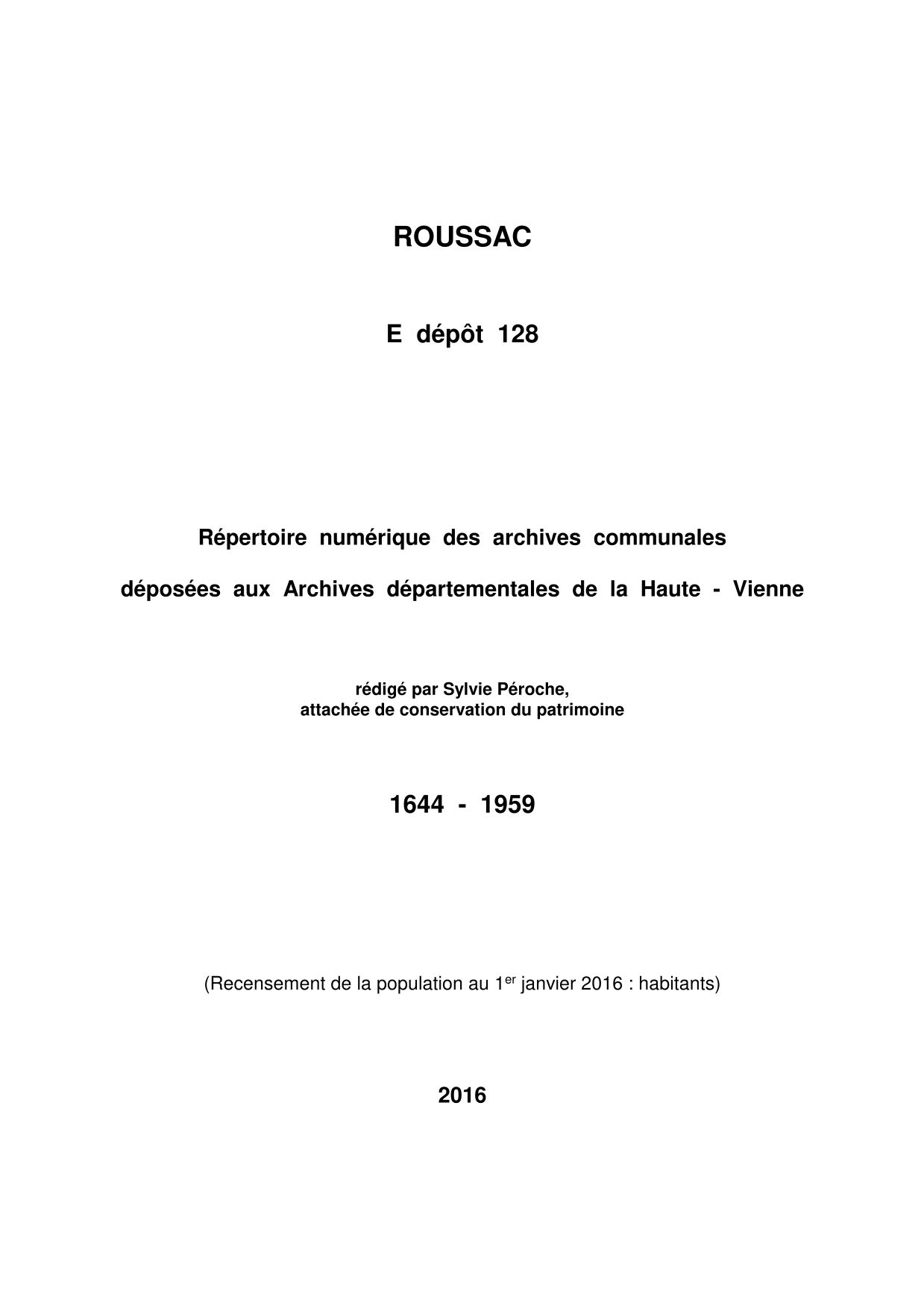 Commune de Roussac. Répertoire numérique des archives communales déposées aux Archives départementales de la Haute-Vienne, par S. Péroche, 2016, 20 p. dact.
