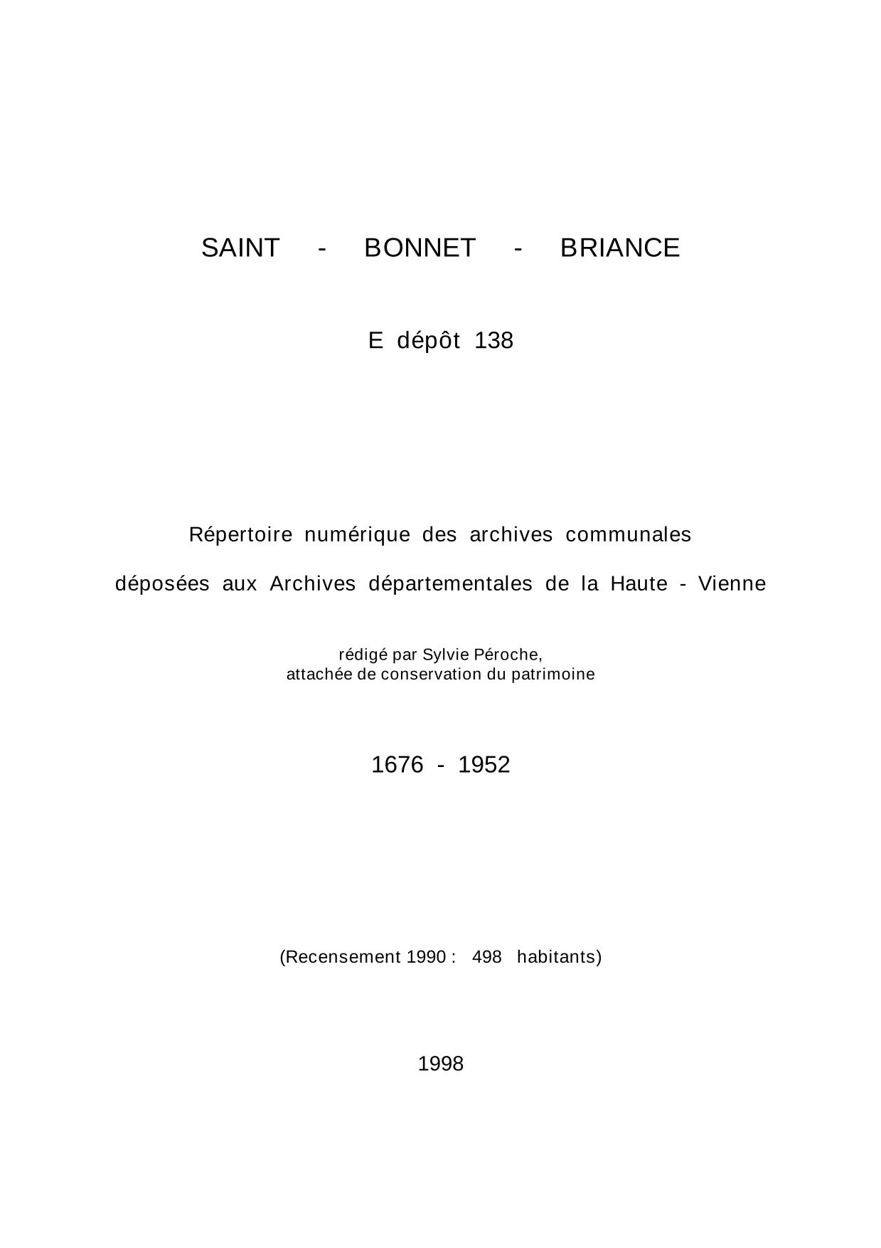 Commune de Saint-Bonnet-Briance. Répertoire numérique des archives communales déposées aux Archives départementales de la Haute-Vienne, par S. Péroche, 1998, 17 p. dact.