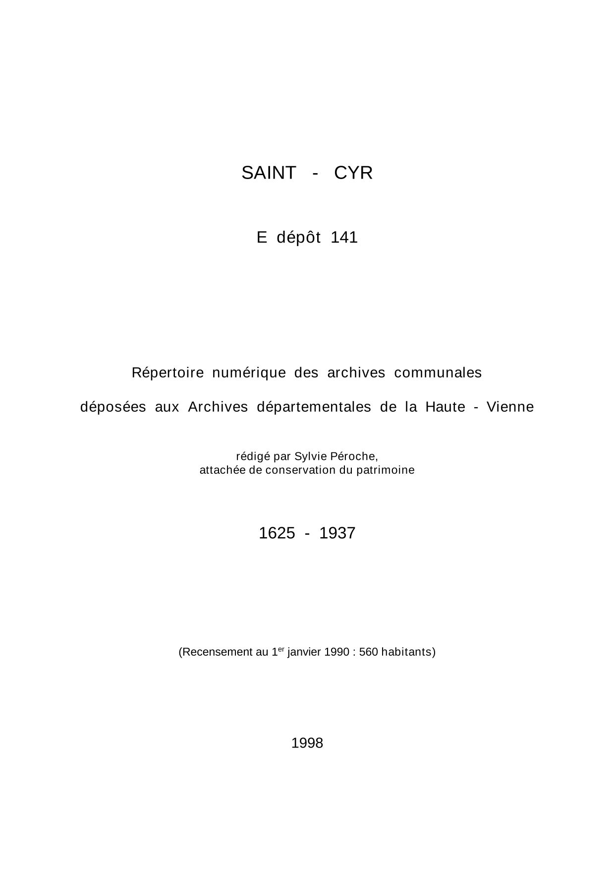 Commune de Saint-Cyr. Répertoire numérique des archives communales déposées aux Archives départementales de la Haute-Vienne, par S. Péroche, 1998, 12 p. dact.