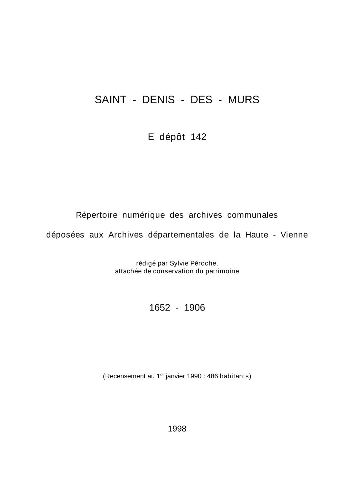 Commune de Saint-Denis-des-Murs. Répertoire numérique des archives communales déposées aux Archives départementales de la Haute-Vienne, par S. Péroche, 1998, 14 p. dact.