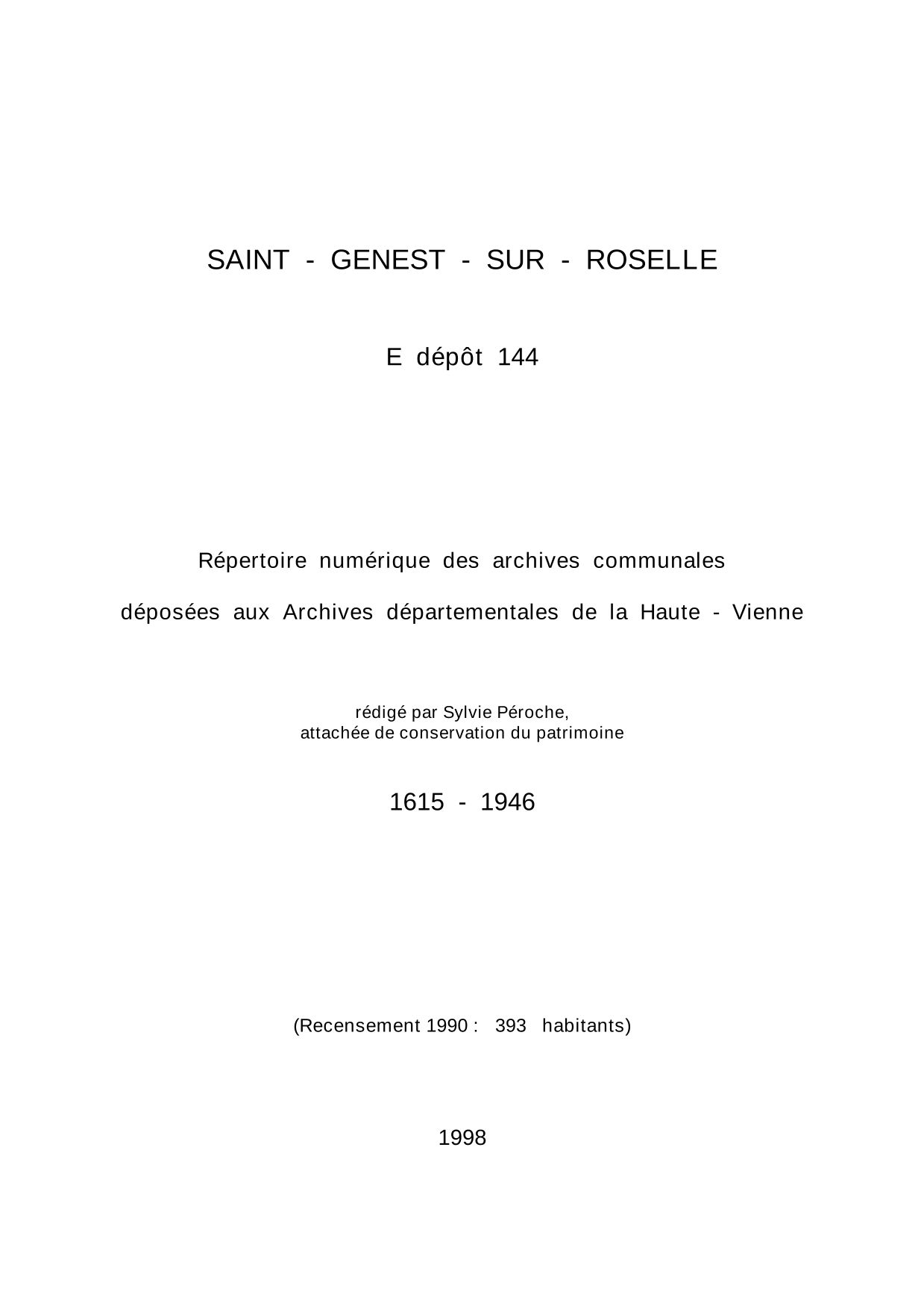 Commune de Saint-Genest-sur-Roselle. Répertoire numérique des archives communales déposées aux Archives départementales de la Haute-Vienne, par S. Péroche, 1998, 15 p. dact.