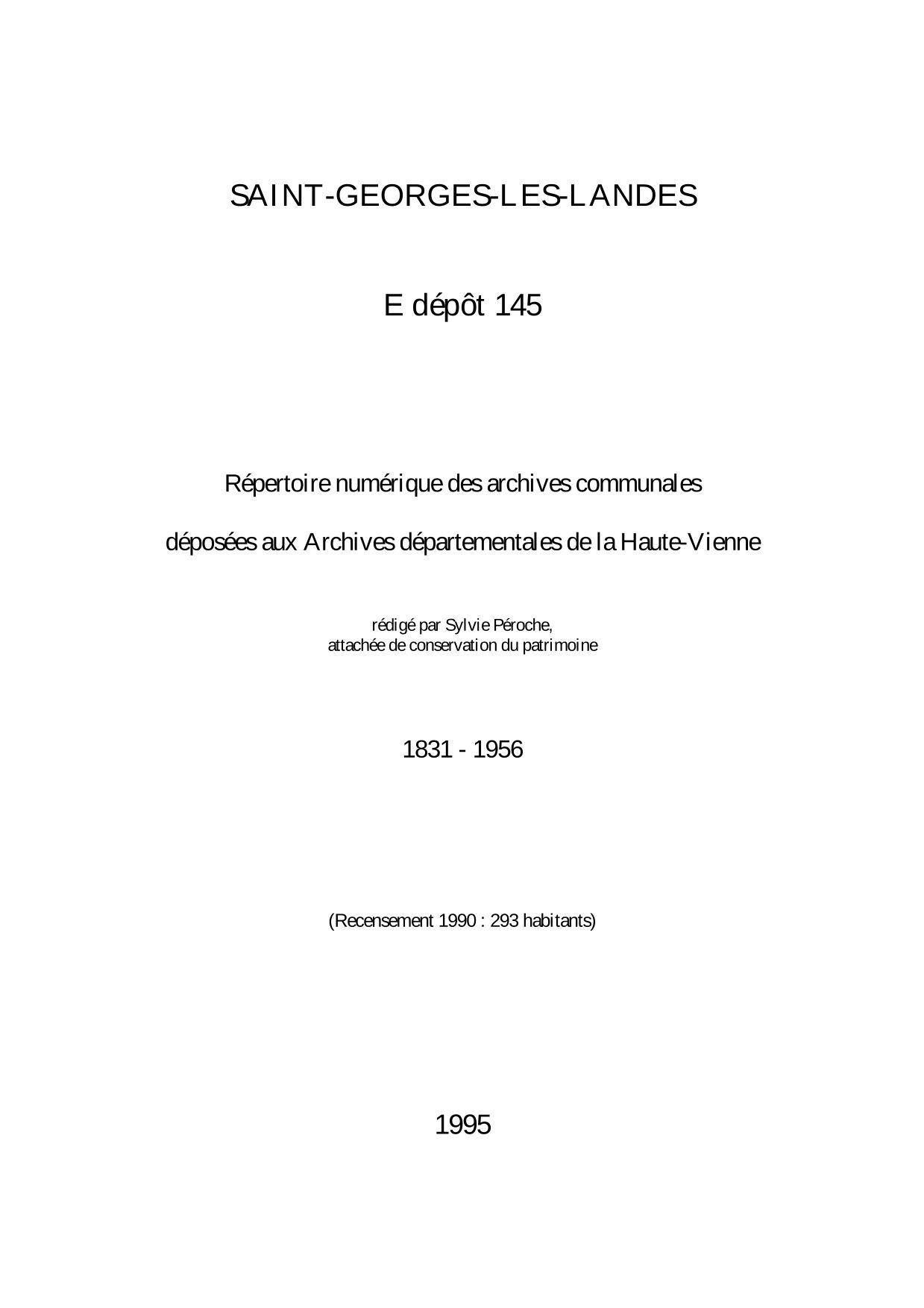 Commune de Saint-Georges-les-Landes. Répertoire numérique des archives communales déposées aux Archives départementales de la Haute-Vienne, par S. Péroche, 1995, 9 p. dact.