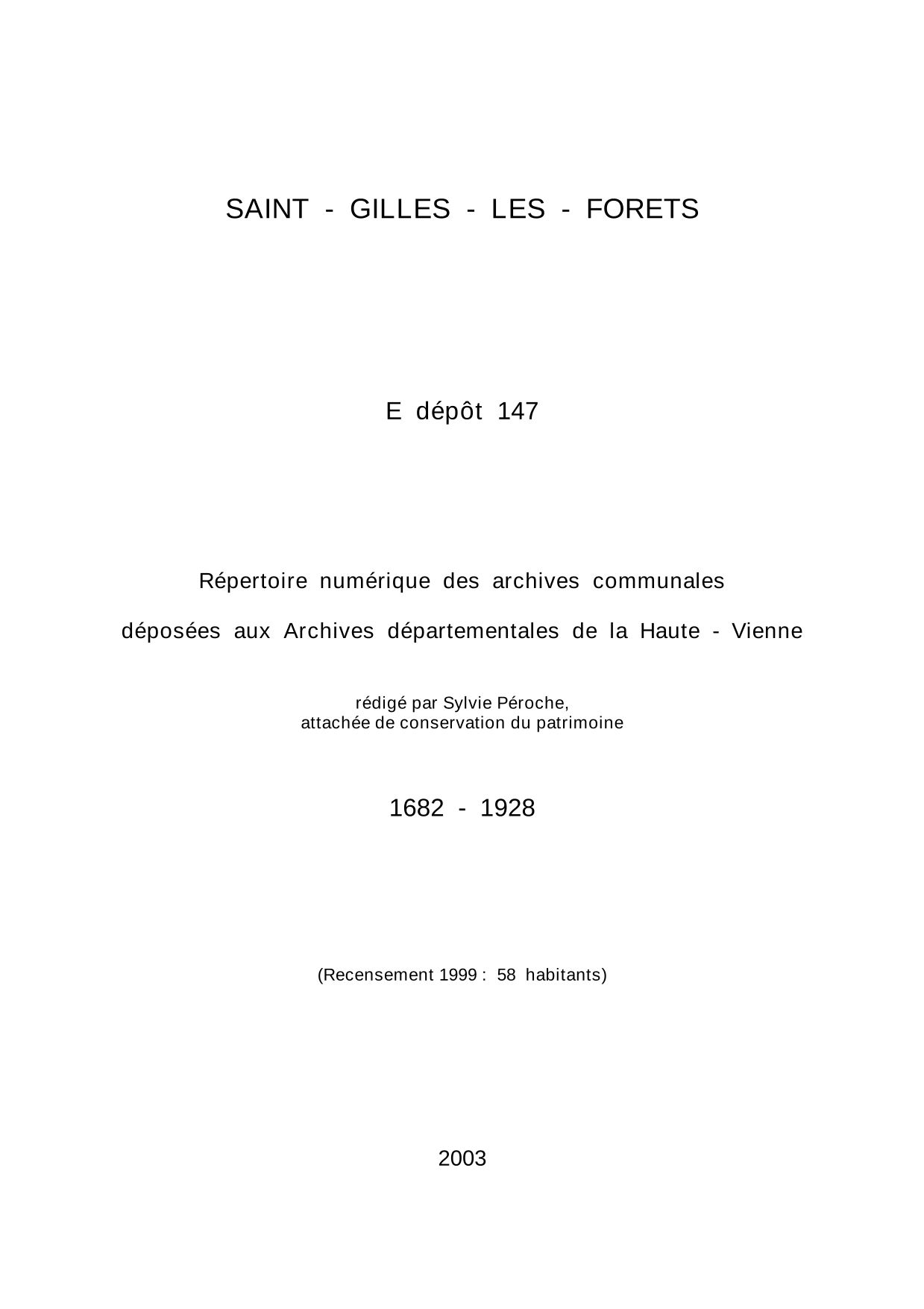 Commune de Saint-Gilles-les-Forêts. Répertoire numérique des archives communales déposées aux Archives départementales de la Haute-Vienne, par S. Péroche, 2003, 9 p. dact.