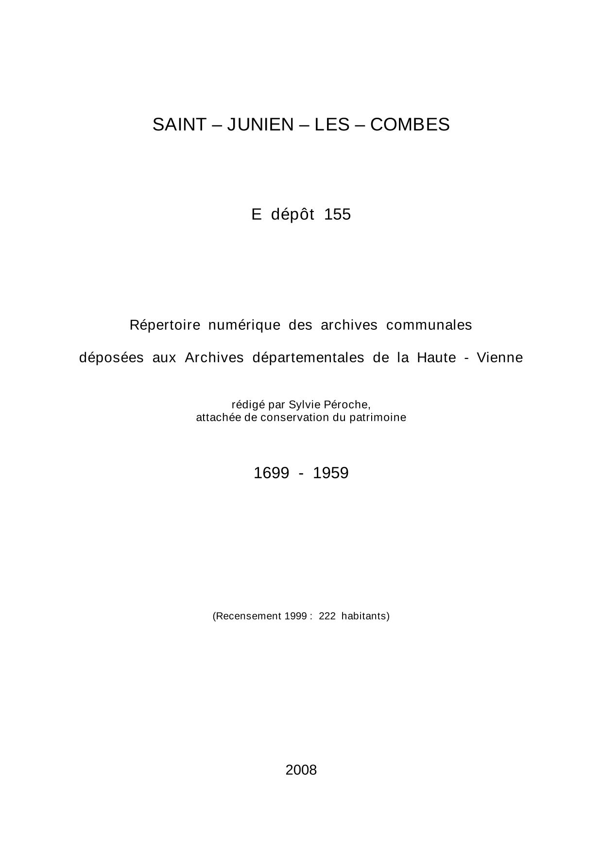 Commune de Saint-Junien-les-Combes. Répertoire numérique des archives communales déposées aux Archives départementales de la Haute-Vienne, par S. Péroche, 2008, 17 p. dact.