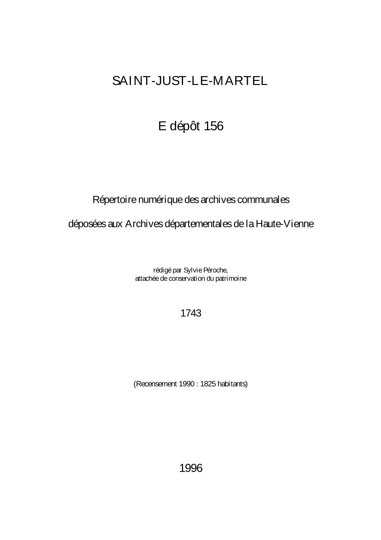 Commune de Saint-Just-le-Martel. Répertoire numérique des archives communales déposées aux Archives départementales de la Haute-Vienne, par S. Péroche, 1996, 4 p. dact.