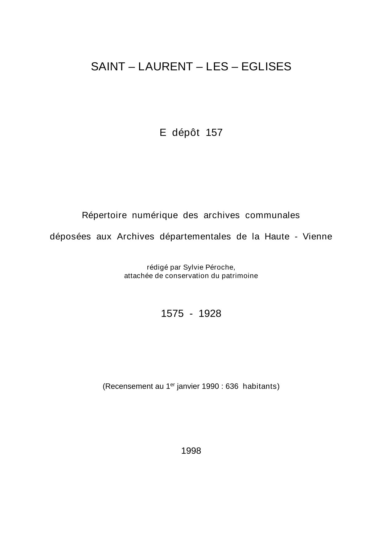Commune de Saint-Laurent-les-Eglises. Répertoire numérique des archives communales déposées aux Archives départementales de la Haute-Vienne, par S. Péroche, 1998, 10 p. dact.