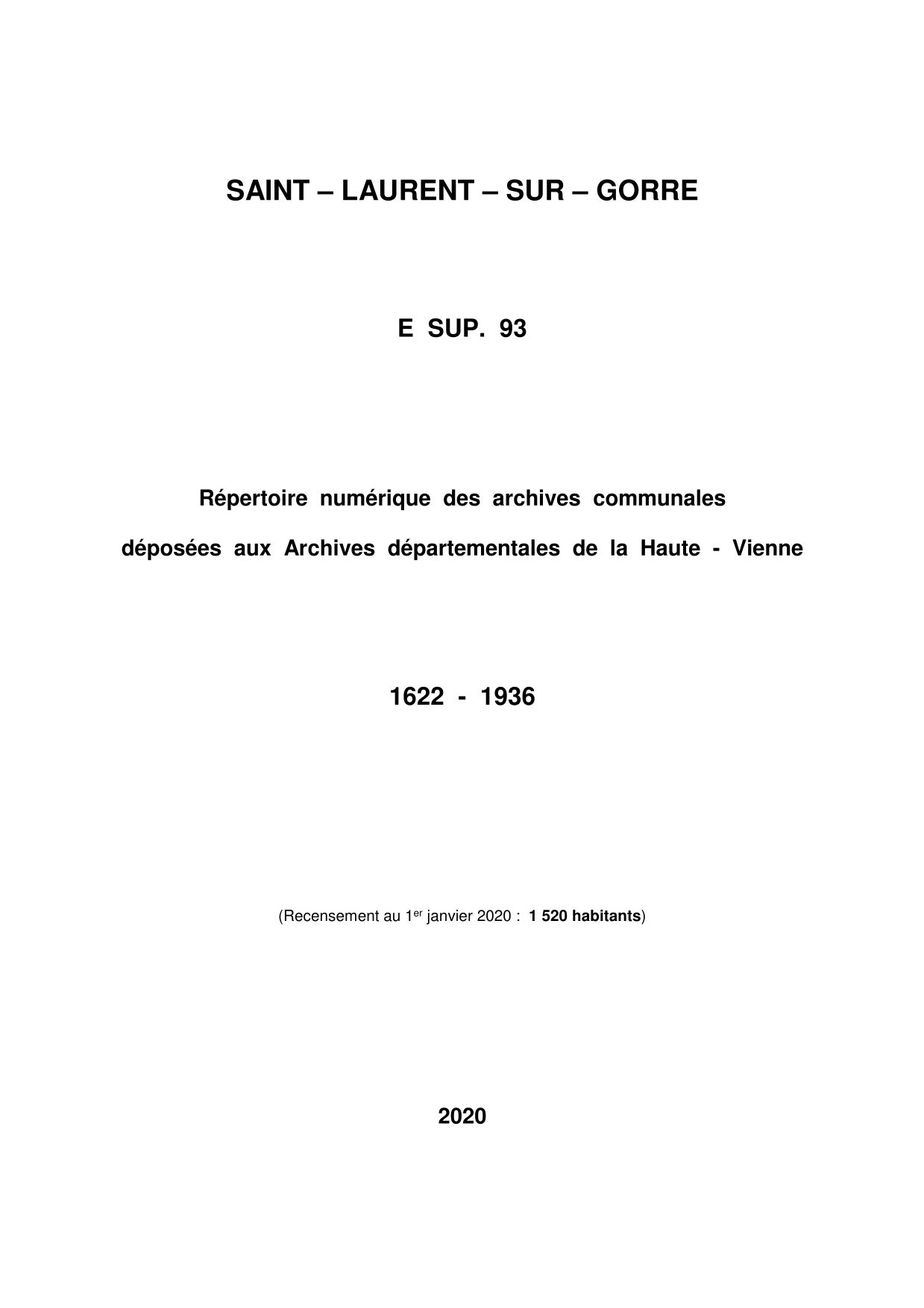 Commune de Saint-Laurent-sur-Gorre. Répertoire numérique des archives communales déposées aux Archives départementales de la Haute-Vienne, par S. Péroche, 2020, 7 p. dact.