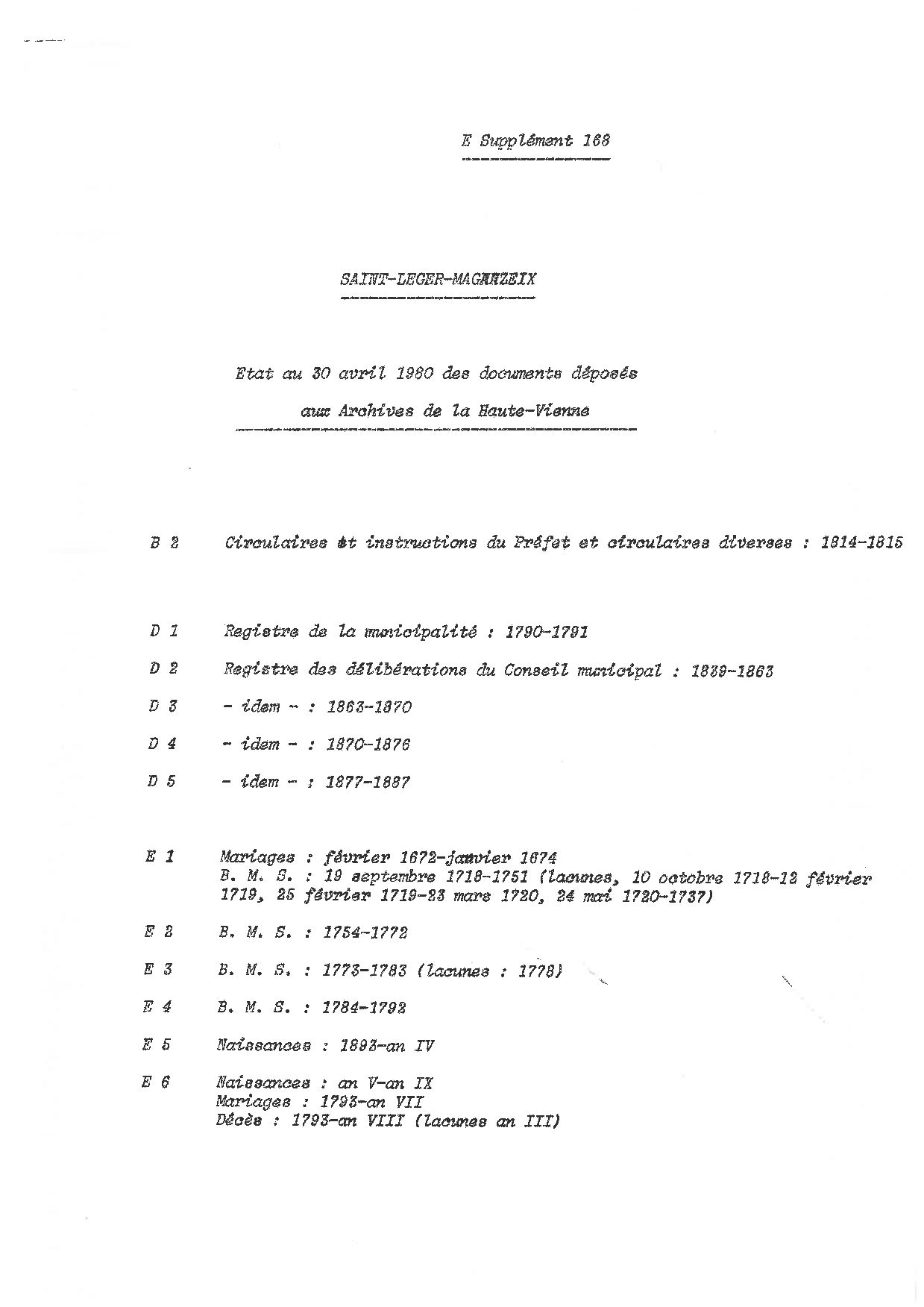 Commune de Saint-Léger-Magnazeix. État numérique des archives communales déposées aux Archives départementales de la Haute-Vienne, 1980, 3 p. dact.