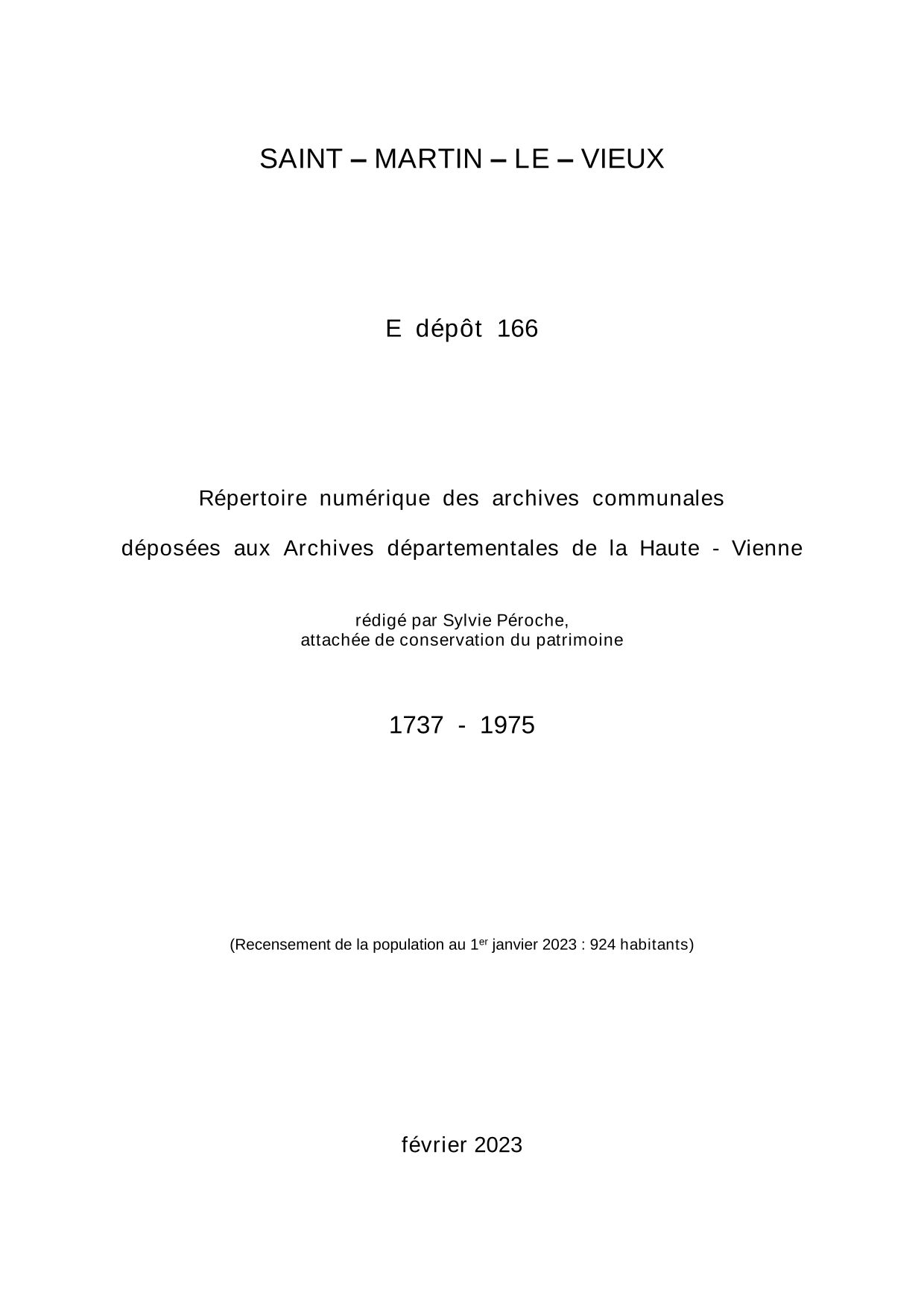 Commune de Saint-Martin-le-Vieux. Répertoire numérique des archives communales déposées aux Archives départementales de la Haute-Vienne, par S. Péroche, 2020, 8 p. dact.