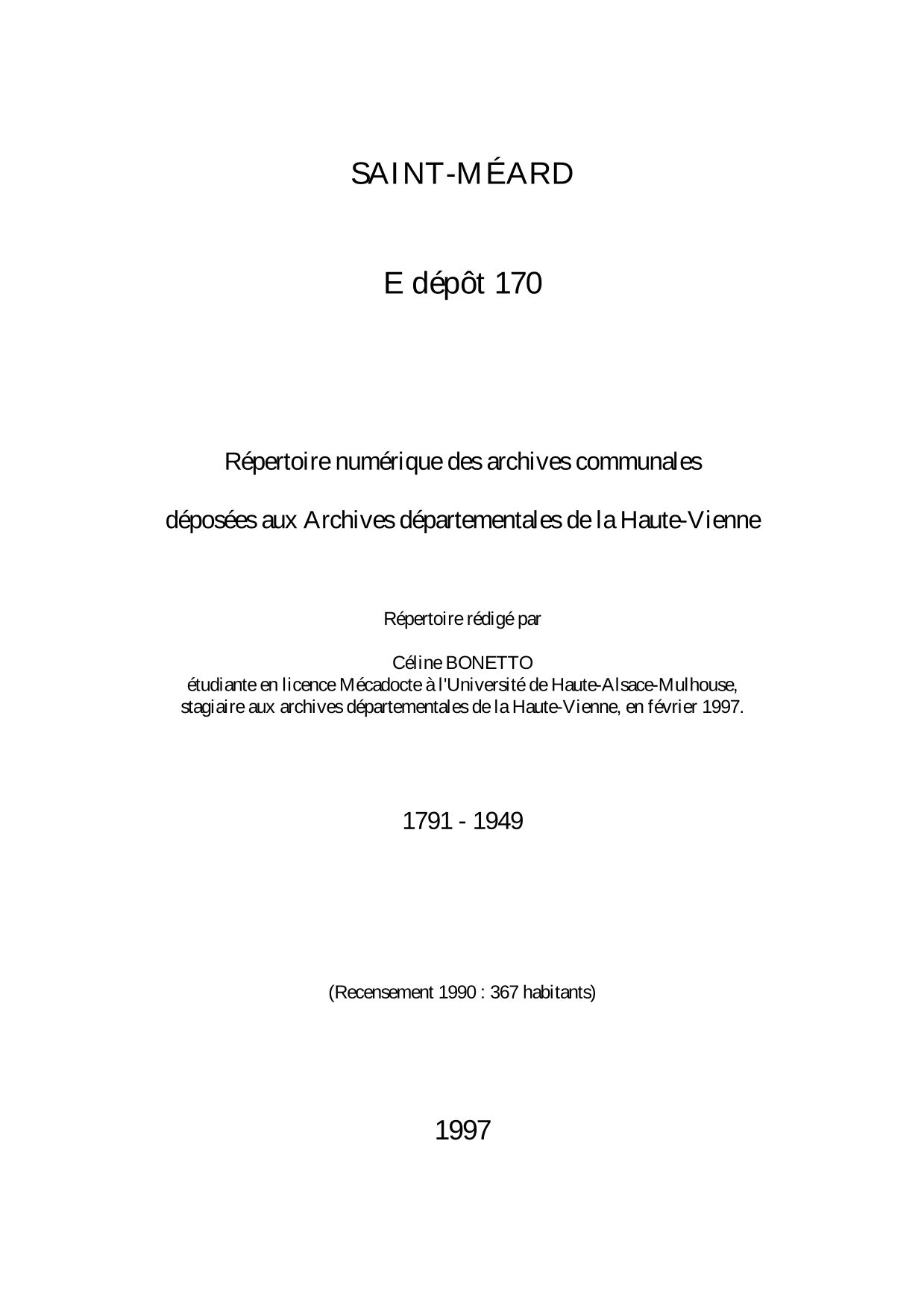 Commune de Saint-Méard. Répertoire numérique des archives communales déposées aux Archives départementales de la Haute-Vienne, par C. Bonetto, stagiaire, 1997, 13 p. dact.