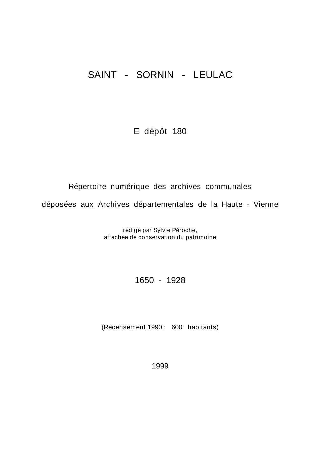 Commune de Saint-Sornin-Leulac. Répertoire numérique des archives communales déposées aux Archives départementales de la Haute-Vienne, par S. Péroche, 1999, 17 p. dact.