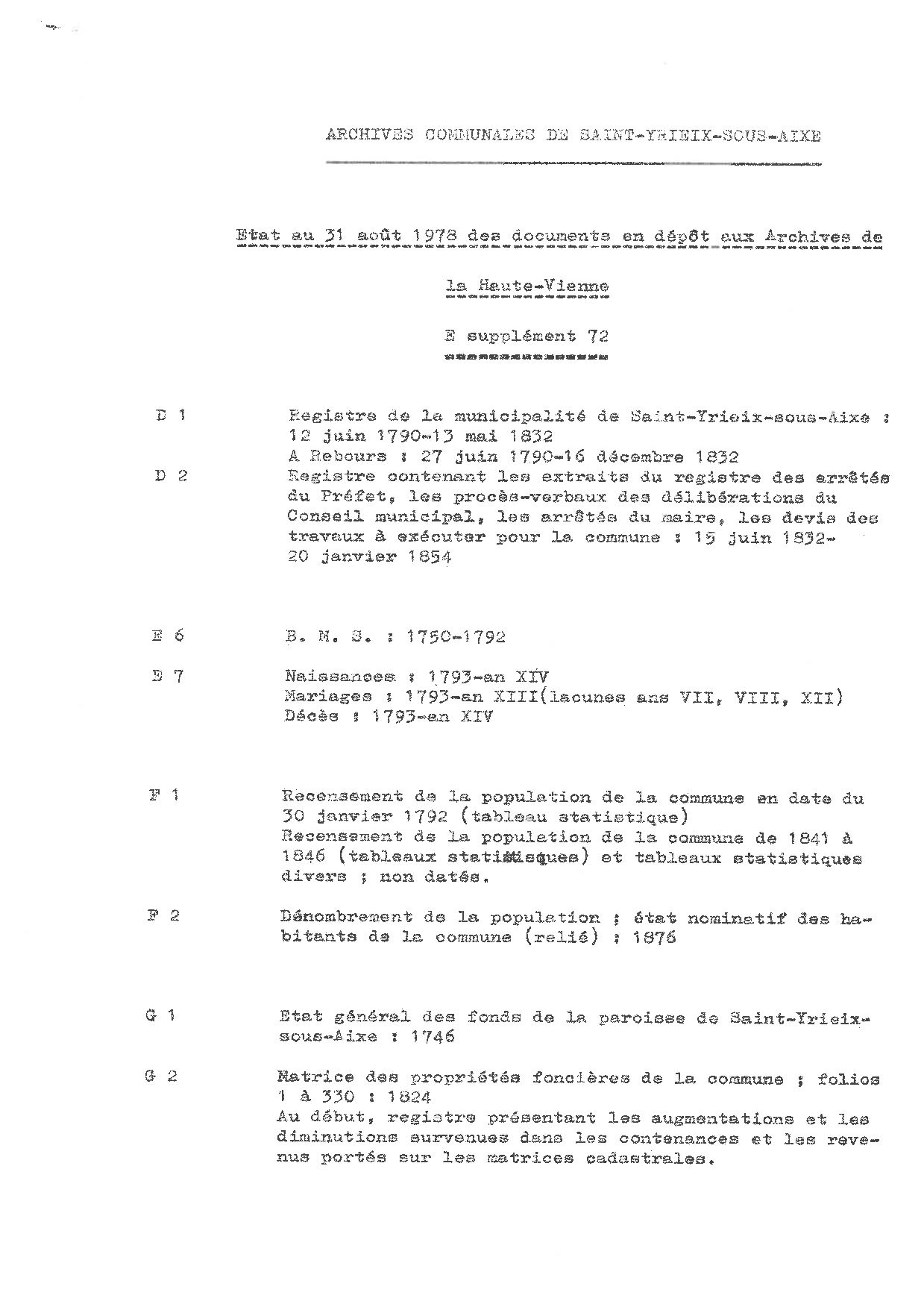 Commune de Saint-Yrieix-sous-Aixe. État numérique des archives communales déposées aux Archives départementales de la Haute-Vienne, 1978, 2 p. dact.