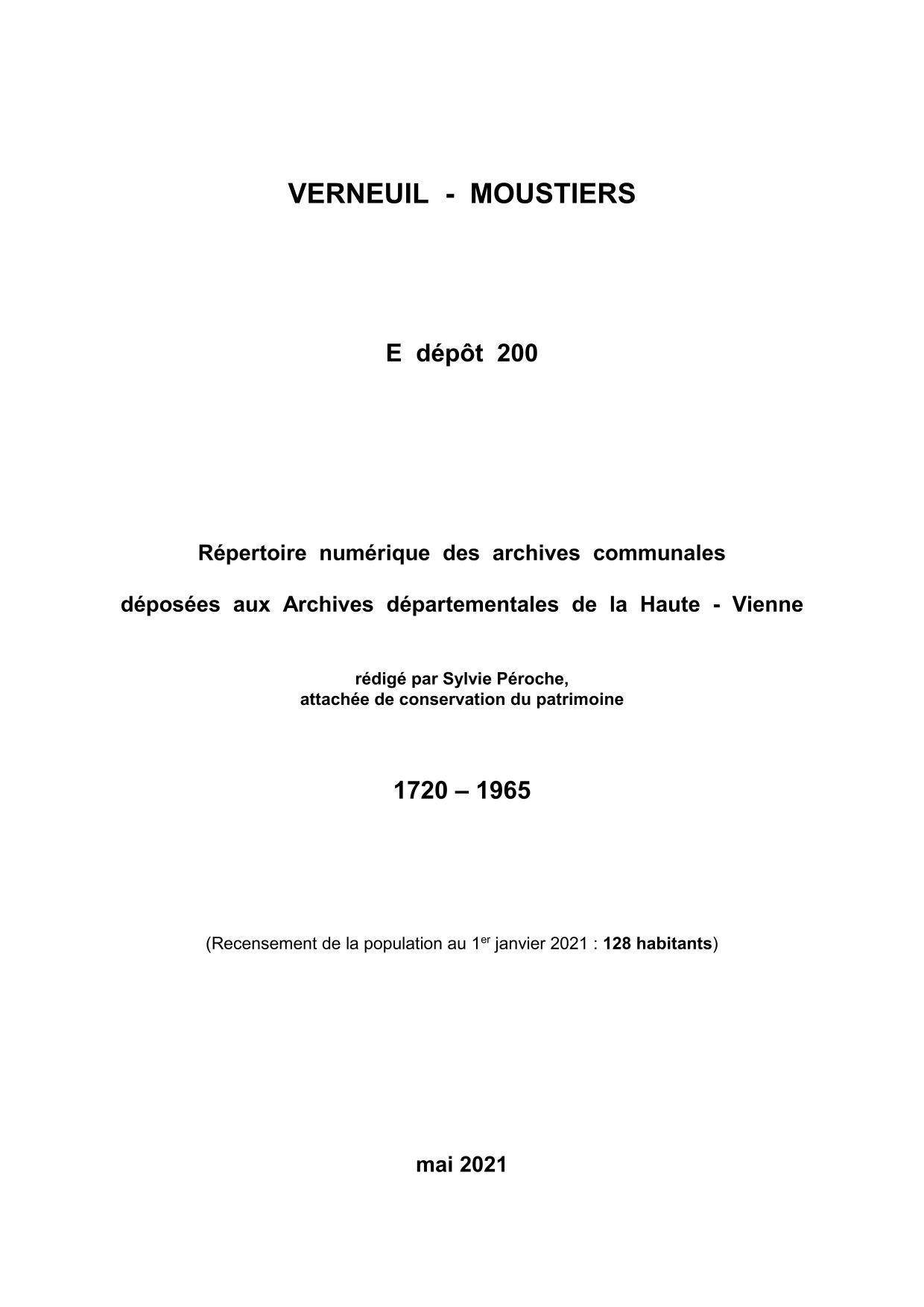 Commune de Verneuil-Moustiers. Répertoire numérique des archives communales déposées aux Archives départementales de la Haute-Vienne, par S. Péroche, 2021, 17 p. dact.
