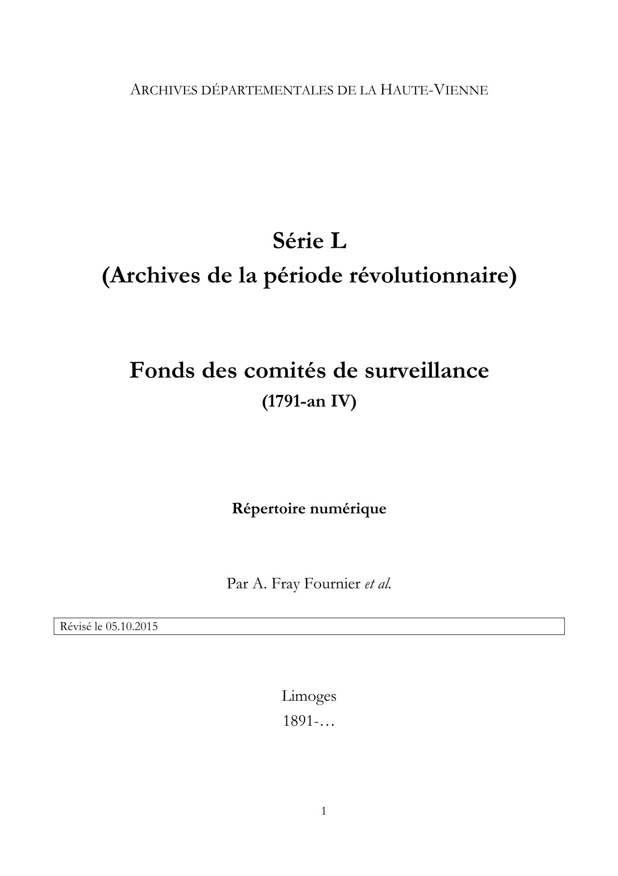 L. Inventaire [répertoire numérique] des documents manuscrits et imprimés de la période révolutionnaire, par A. Fray-Fournier, t. 1, 1891, 167 p. (L 1-885). L SUP 1-30. Répertoire numérique détaillé, par S. Péroche, 2009, 4 p. dact.