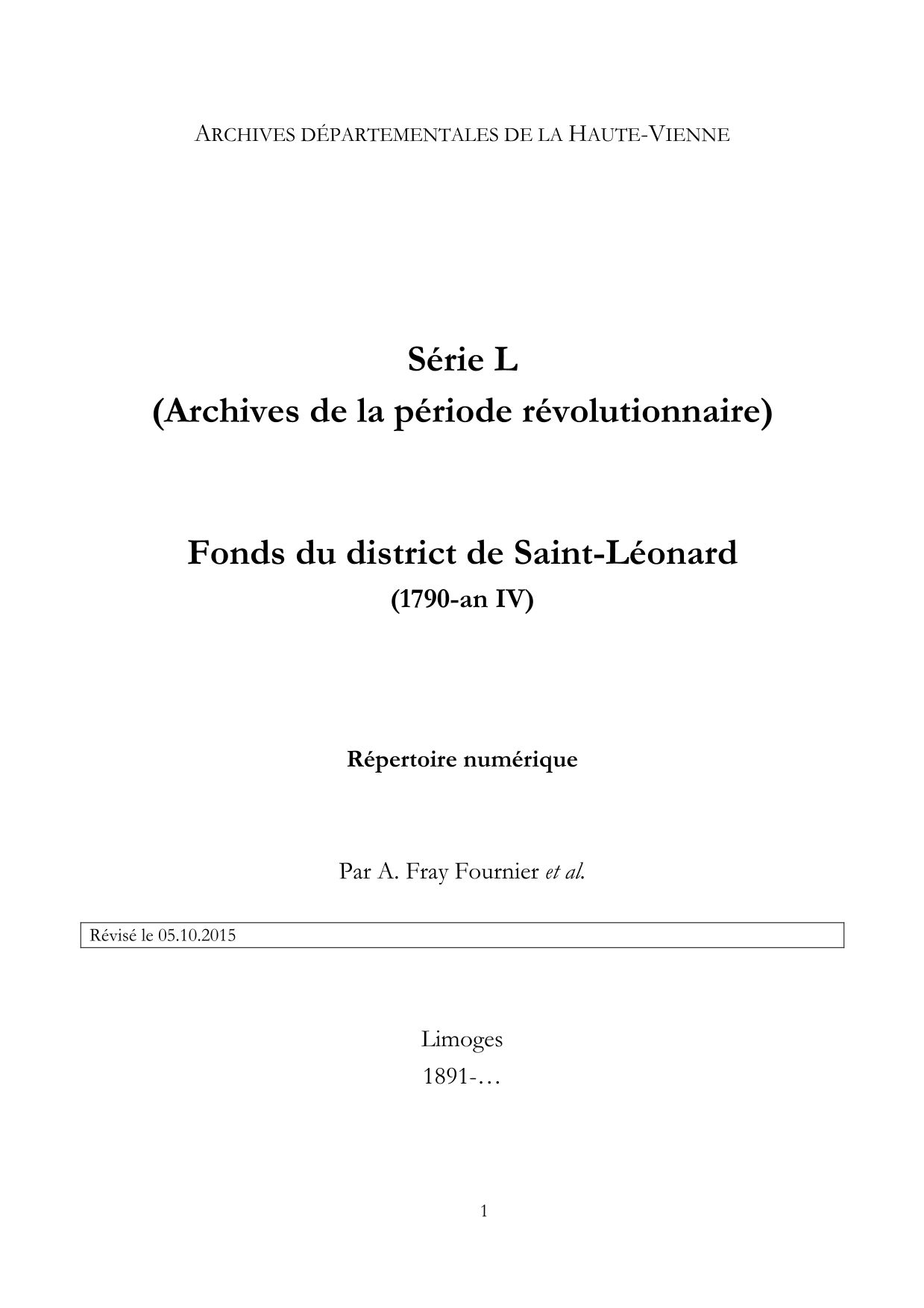 L. Inventaire [répertoire numérique] des documents manuscrits et imprimés de la période révolutionnaire, par A. Fray-Fournier, t. 1, 1891, 167 p. (L 1-885). L SUP 1-30. Répertoire numérique détaillé, par S. Péroche, 2009, 4 p. dact.