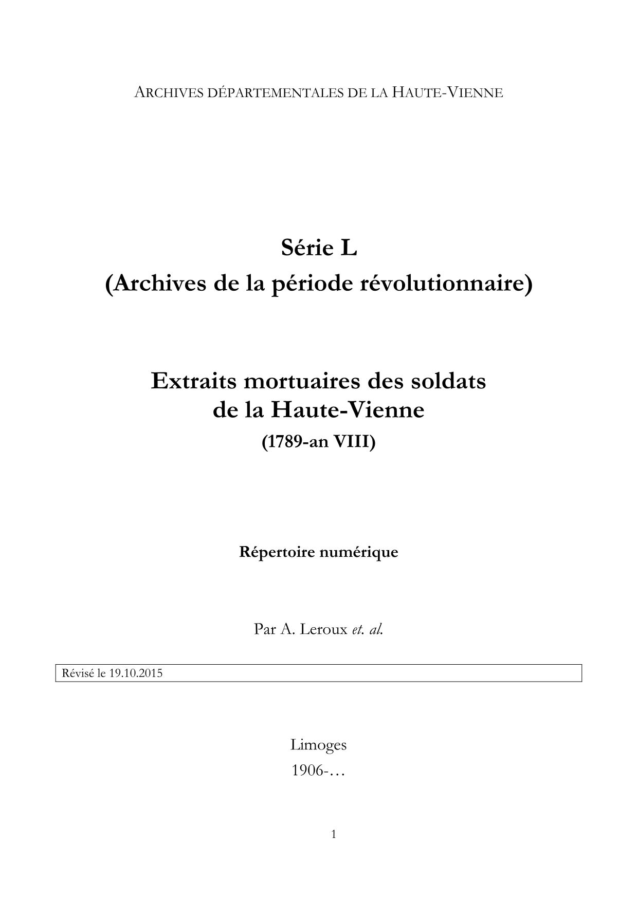 L. Répertoire numérique, par L. Buisson, 1972, 1 p. dact. Les extraits mortuaires ont été reclassés par ordre alphabétique.