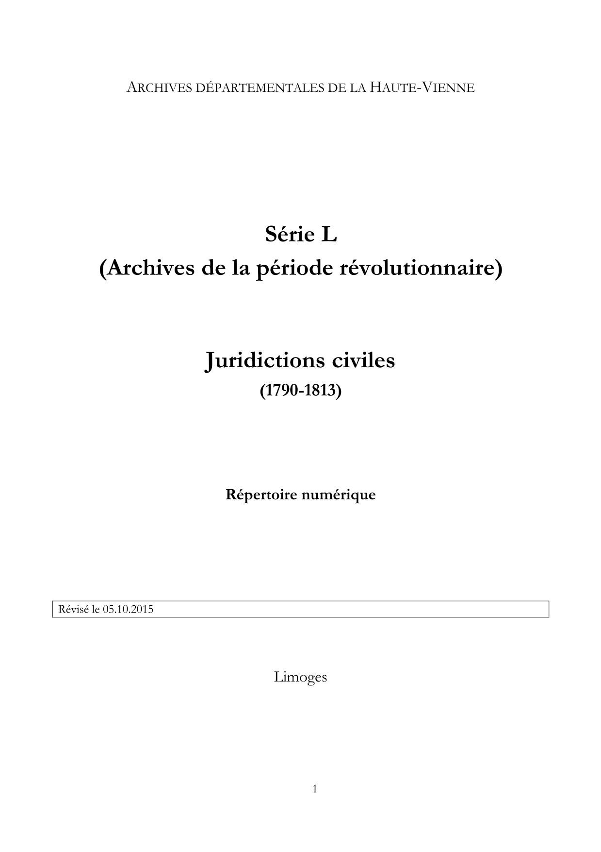 Tribunal civil du département (créé après la suppression des tribunaux de district). Tribunaux des districts de Bellac, du Dorat, de Limoges, Rochechouart, Saint-Léonard et Saint-Yrieix-la-Perche. Justices de paix d'Aixe-sur-Vienne, Ambazac, Bellac, Bessines, Châlus, Châteauneuf-la-Forêt, Châteauponsac, Darnac, Le Dorat, Eymoutiers, Limoges, Lussac-les-Eglises, Magnac-Bourg, Magnac-Laval, Mortemart, Morterolles, Nedde, Nieul, Oradour-sur-Vayres, Peyrat-le-Château, Pierre-Buffière, Rochechouart, Saint-Barbant, Saint-Germain-les-Belles, Saint-Junien, Saint-Laurent-sur-Gorre, Saint-Léonard-de-Noblat, Saint-Mathieu, Saint-Paul, Saint-Sulpice-les-Feuilles, Saint-Yrieix-la-Perche, Sauviat et Solignac.