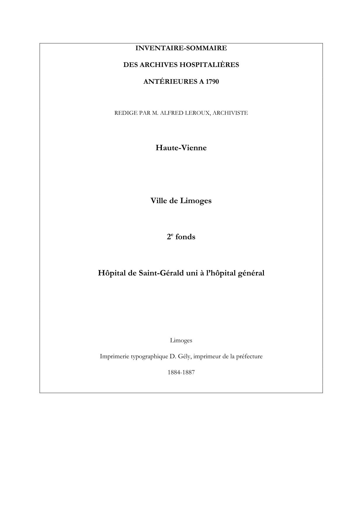 Inventaire sommaire imprimé des archives antérieures à 1790 des hospices et hôpitaux de Limoges, Bellac, Le Dorat, Magnac-Laval et Saint-Yrieix, par A. Leroux, 1884-1887, paginations multiples. Introduction historique. Inventaire des archives de l'époque révolutionnaire des hospices et hôpitaux d'Eymoutiers, Lussac-les-Eglises, Magnac-Laval, Saint-Yrieix, Limoges, dans Alfred Leroux, Les sources de l'histoire de la Haute-Vienne pendant la Révolution, Limoges, 1908, 170 p. (p. 34-66).