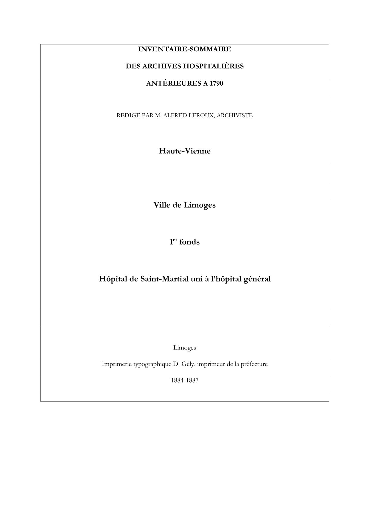 Inventaire sommaire imprimé des archives antérieures à 1790 des hospices et hôpitaux de Limoges, Bellac, Le Dorat, Magnac-Laval et Saint-Yrieix, par A. Leroux, 1884-1887, paginations multiples. Introduction historique. Inventaire des archives de l'époque révolutionnaire des hospices et hôpitaux d'Eymoutiers, Lussac-les-Eglises, Magnac-Laval, Saint-Yrieix, Limoges, dans Alfred Leroux, Les sources de l'histoire de la Haute-Vienne pendant la Révolution, Limoges, 1908, 170 p. (p. 34-66).
