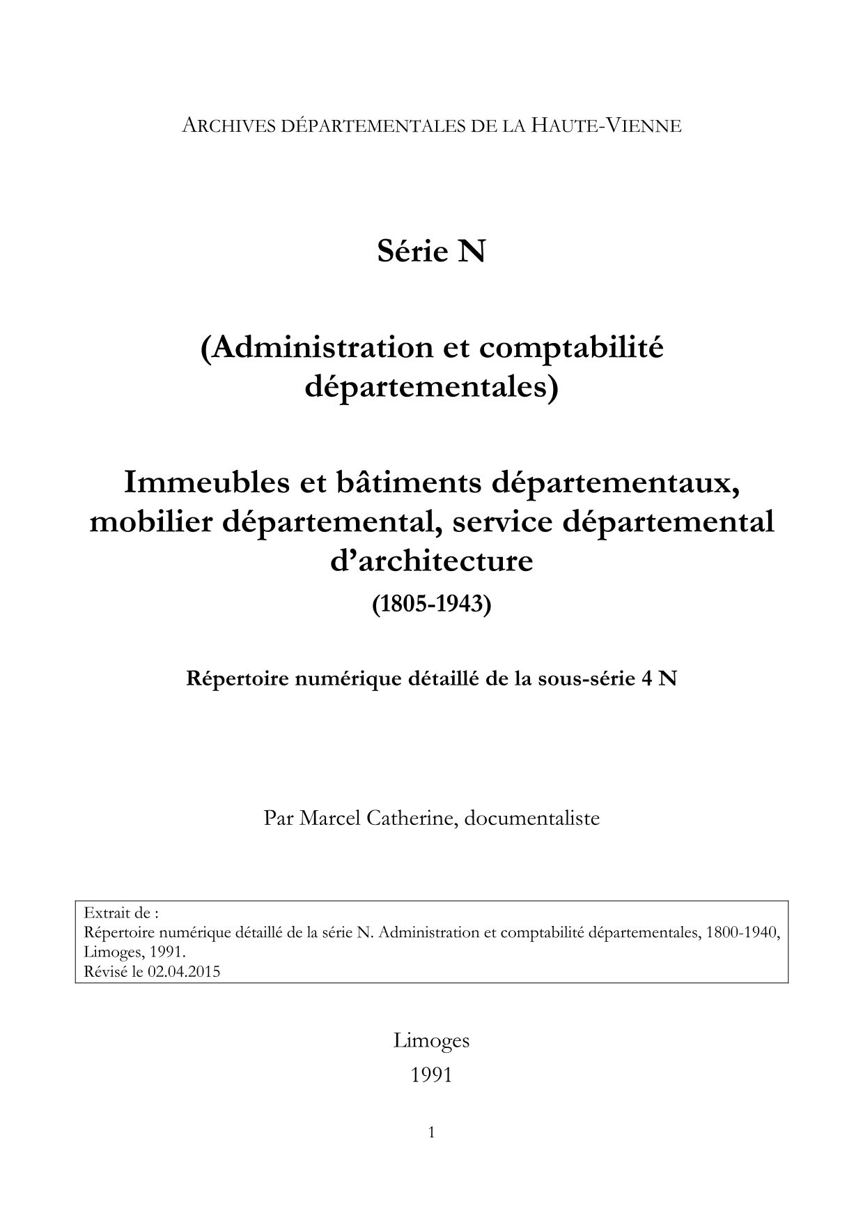 4 N. Répertoire numérique, par M. Catherine (extrait du répertoire dactylographié, 1991, p. 20-47).