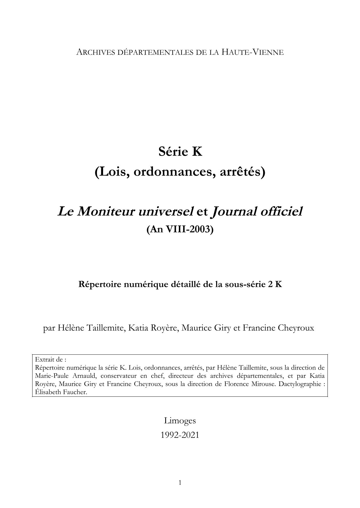 2 K. Répertoire numérique, par H. Taillemite et F. Cheyroux, tenu à jour depuis 1992.